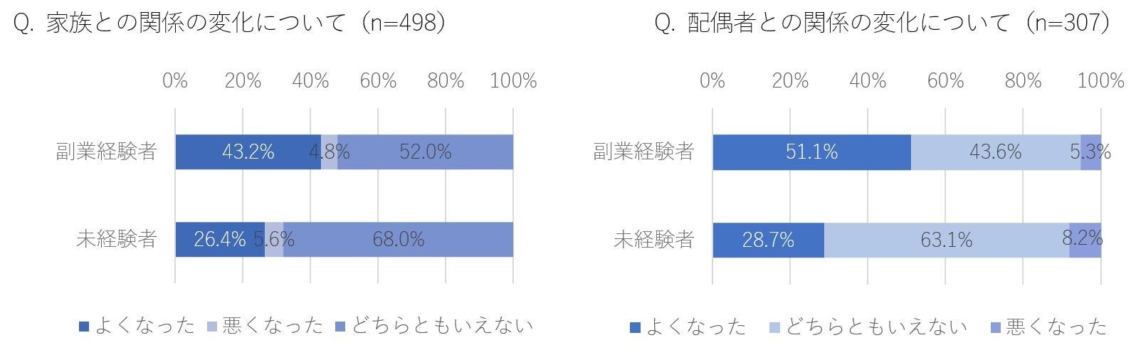 ・副業経験者は、人間関係の広がりの実感や、独立後の家族・配偶者との関係性も良好という結果に