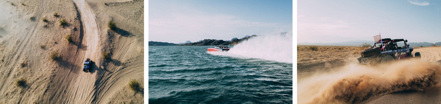 文字の後ろのアイコンはタイヤの跡、波、砂の波紋を表しています。