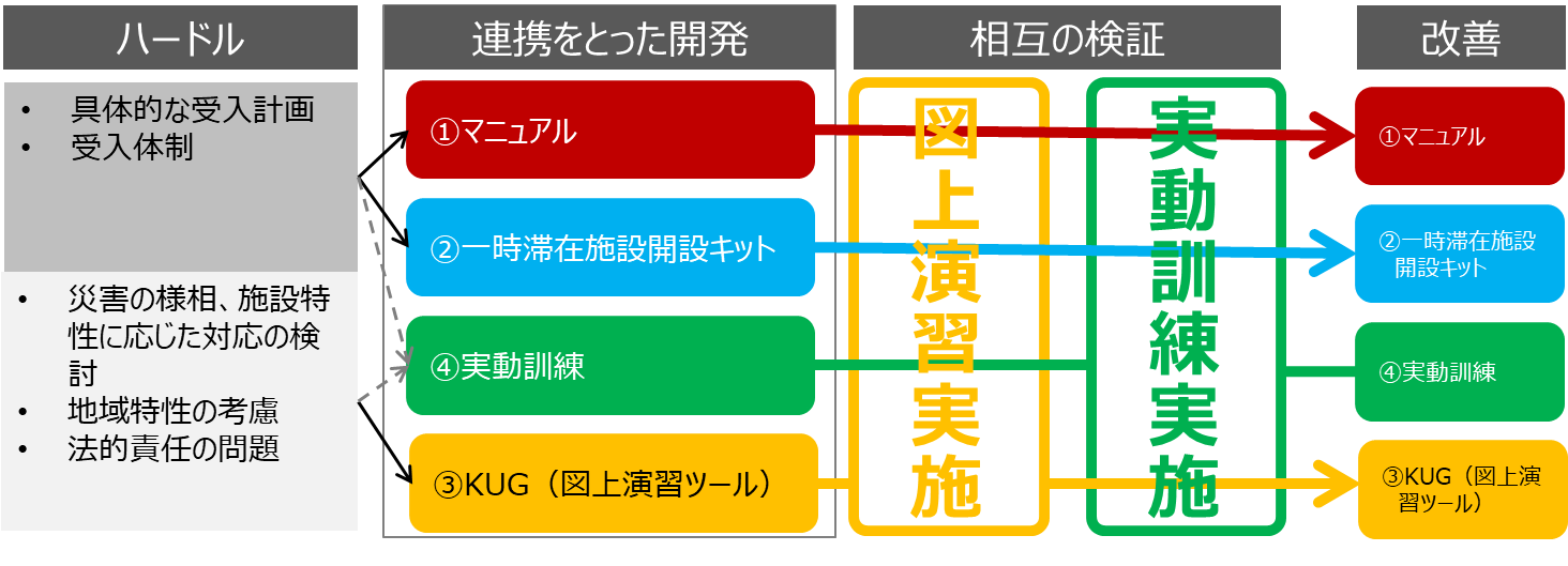 民間事業者による一時滞在施設設置にあたっては、具体的な受入計画や組織体制の整備、災害の様相や施設特性に応じた対応、地域特性の考慮の必要性、法的責任の問題等、実務上のハードルが高いことが課題となっています。このような課題を踏まえ、本協議会では、①汎用的な一時滞在施設運営マニュアル、②マニュアルを可視化した一時滞在施設開設キット、③実務上の課題を検討する図上演習ツール、④実動訓練という4つの要素を総合的なプログラムとして相互に連携させることで、より高い効果を発揮させる取り組みを実践しています※。