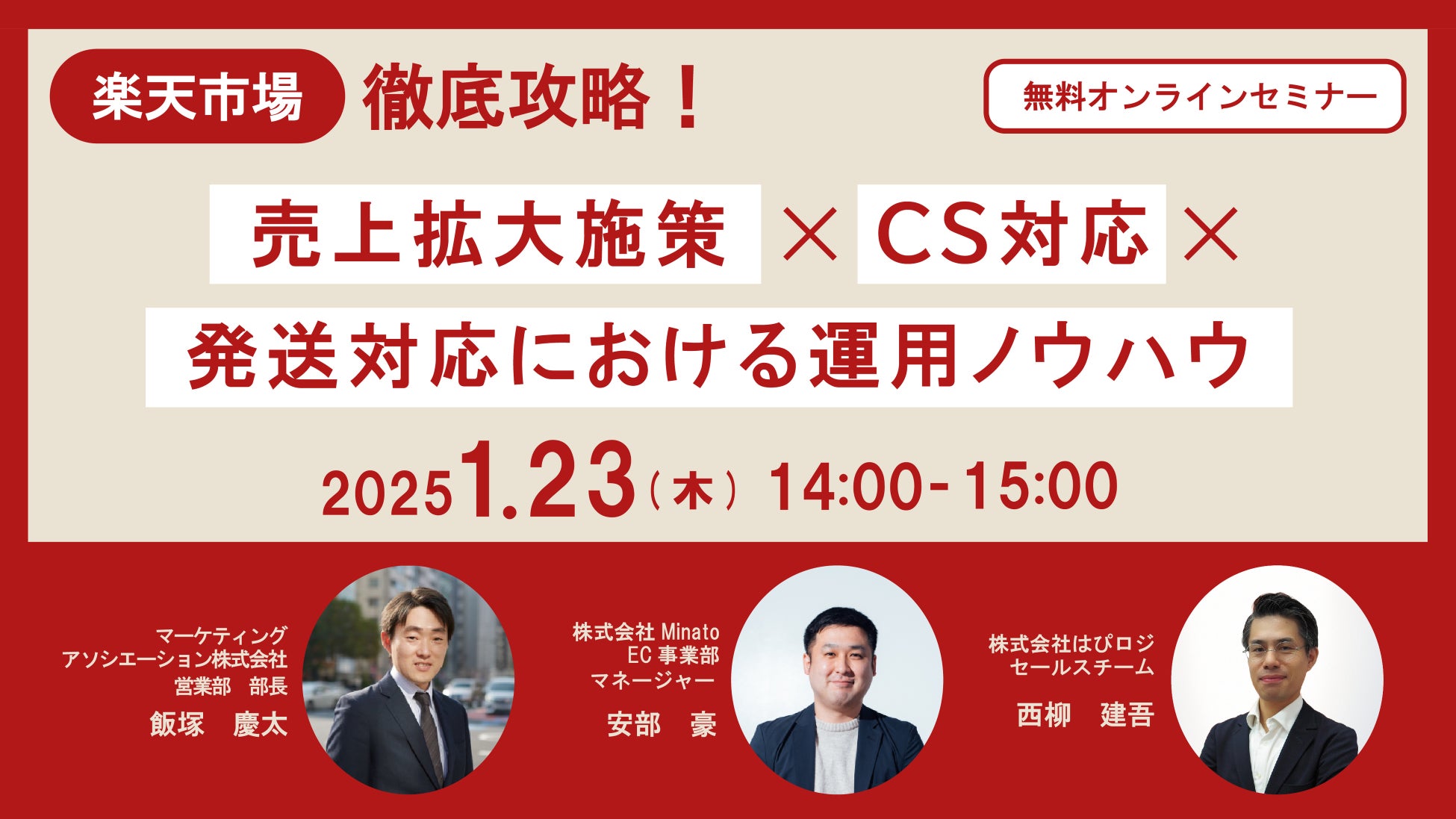 マーケティング支援を専門とする株式会社Minato(本社:東京都港区、代表取締役CEO:山﨑雄太)は、マーケティングアソシエーション株式会社(本社:東京都台東区、代表取締役:中園広和)と株式会社はぴロジ(本社:東京都港区、代表取締役:森憲史)と3社共同で、『楽天市場徹底攻略!売上拡大施策×CS対応×発送対応における運用ノウハウ』をテーマに、2025年1月23日(木)14時より無料オンラインセミナーを開催いたします。EC事業部マネージャーの安部豪が「【今日から出来る】楽天市場売上向上のための15の具体施策」をテーマに登壇いたします。