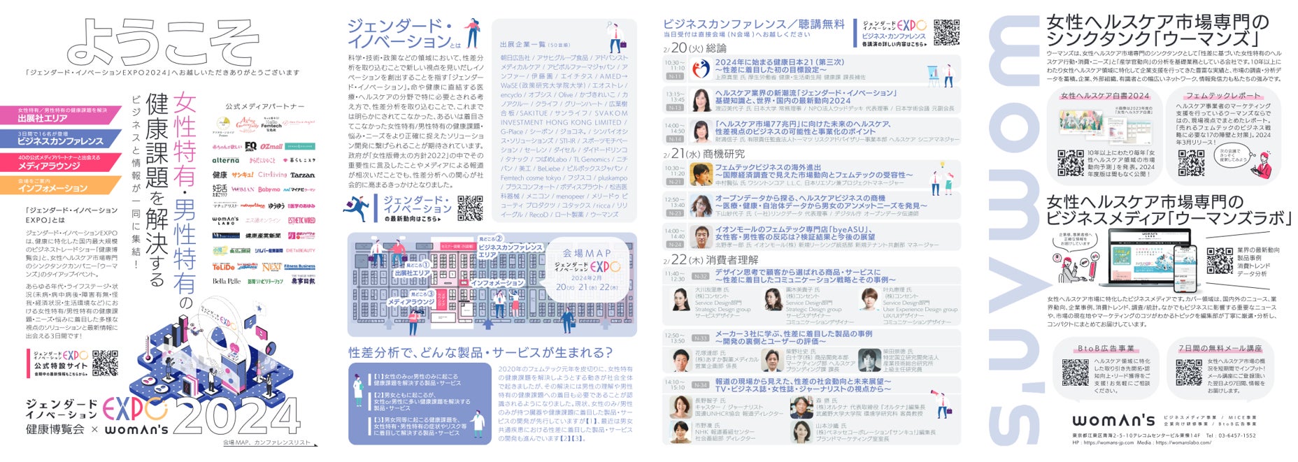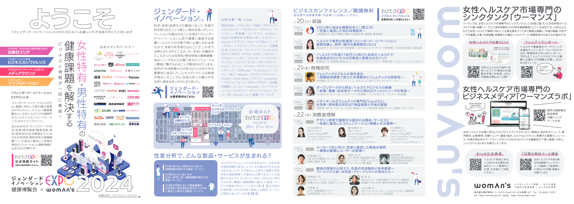 ジェンダード・イノベーションEXPOの専用リーフレット。出展社一覧、ビジネスカンファレンスの全プログラム、公式メディアパートナーの他、ヘルスケア業界におけるジェンダード・イノベーションの解説を掲載しました。