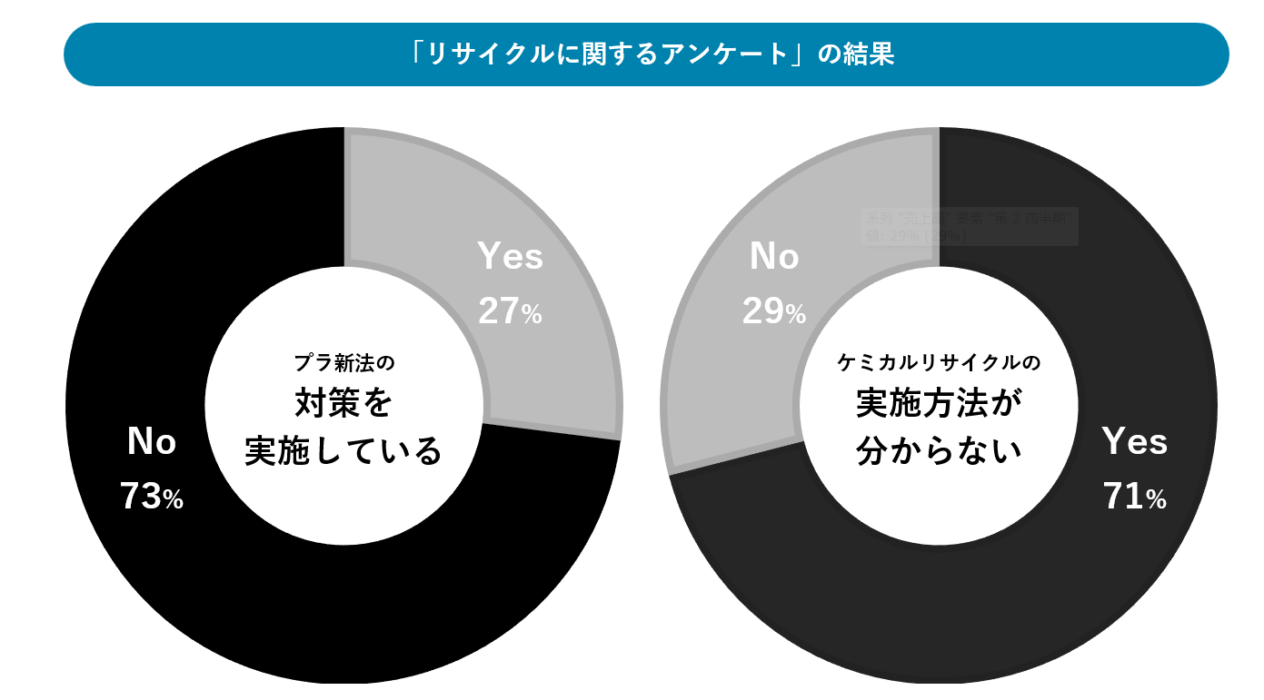 期待とは裏腹な事業者の実情を測るため、サティスファクトリーは廃棄物処理や資源循環等に関心をもつ事業者に、『リサイクルに関するアンケート』を実施しました。その結果、59%が「プラ新法の対策を行う必要がある」のにもかかわらず、73%が「プラ新法の対策を実施していない」ことが分かりました。さらに71%が、対策の有効な手法といえる「ケミカルリサイクルの実施方法が分からない」という回答でした。