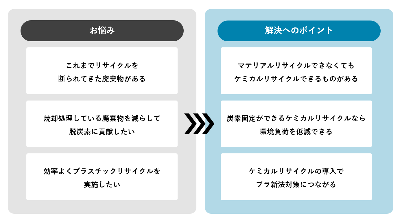 プラスチックの再資源化といえば、これまでの主流はマテリアルリサイクルでした。ただし、この手法では単一素材でなければ再生物の品質を保つことが難しく、樹脂の選別や不純物の除去に手間がかかります。そこでケミカルリサイクルのニーズと技術が高まるものの、各プラントの事情により地域・品質・物量など受け入れ条件は限定的です。あらゆる業種の排出事業者にとって当たり前の選択肢として普及するには、ケミカルリサイクルの間口を広げる必要があります。