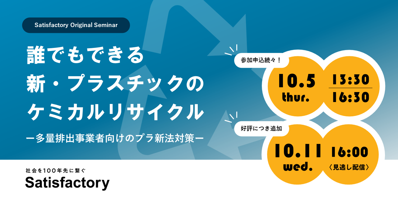アンケート実施を経て、サティスファクトリーはオンラインセミナー『誰でもできる新・プラスチックのケミカルリサイクル ー多量排出事業者向けのプラ新法対策ー』を主催します。リサイクル方法の新しいソリューションから事業者の実情に合った導入方法まで解説しますので、プラスチックのリサイクル方法にお悩みをお持ちの事業者様はぜひご参加ください。(参加申込は専用フォームから)