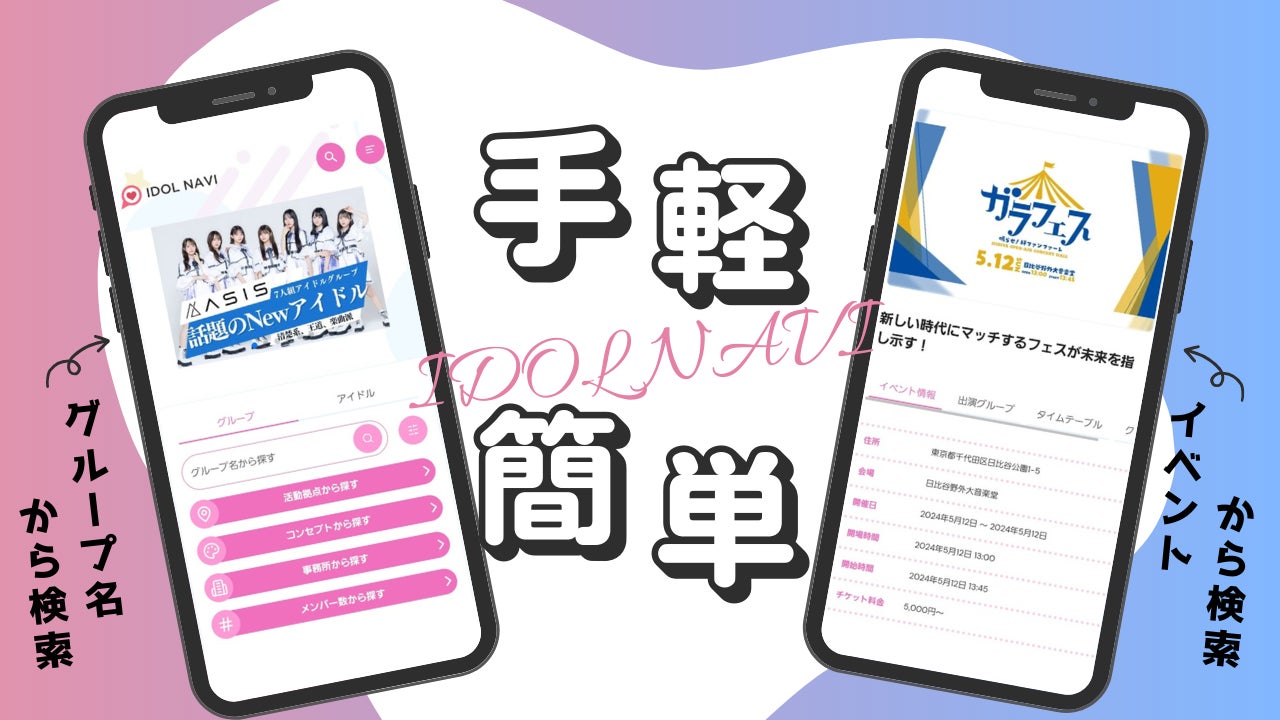 「IDOL NAVI(アイドルナビ)」は、全国のアイドル情報が手軽に見つかるナビゲーションサイトで、最新のイベントやアイドルのプロフィール、おすすめ情報をわかりやすく提供していきます。