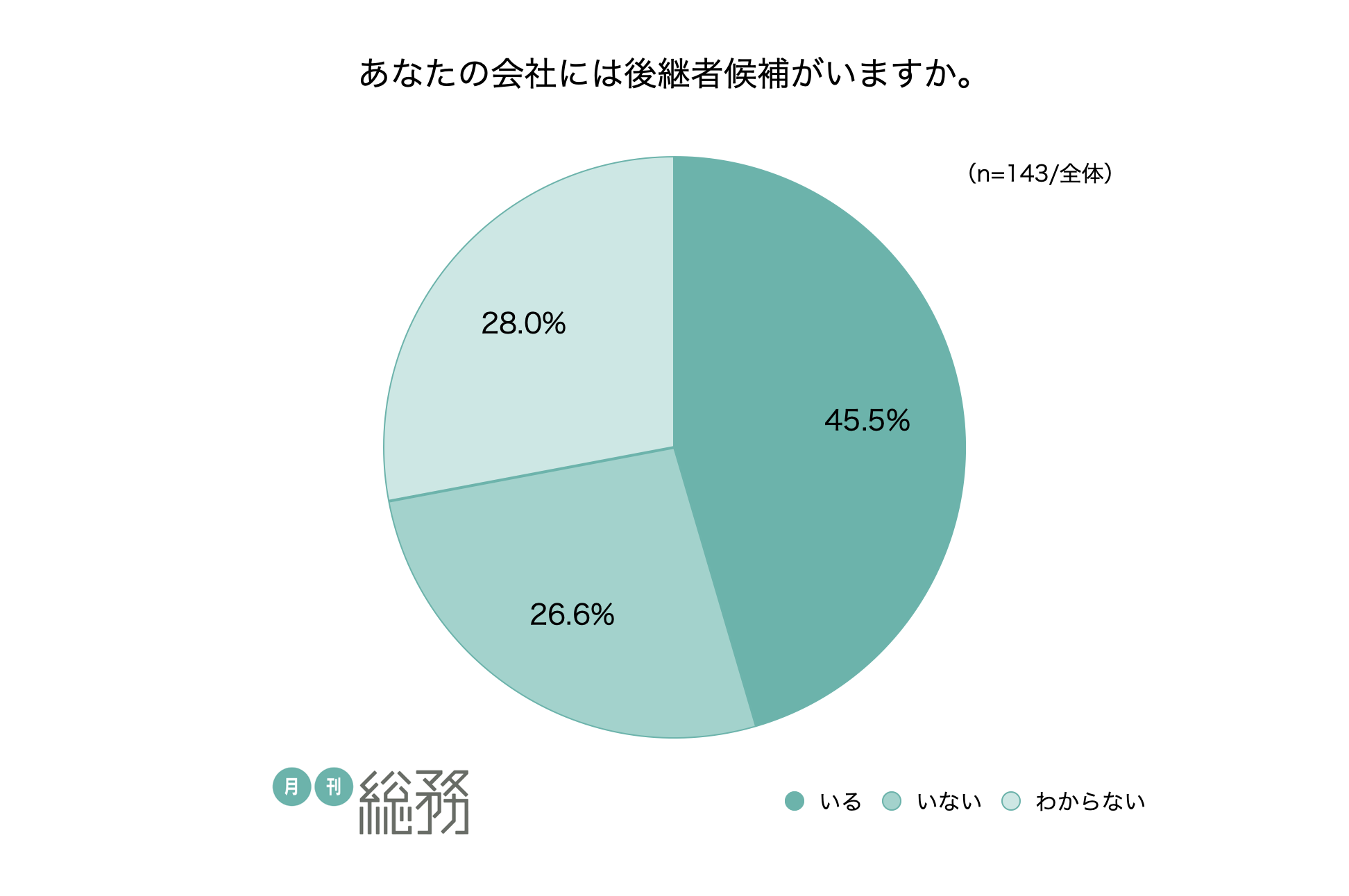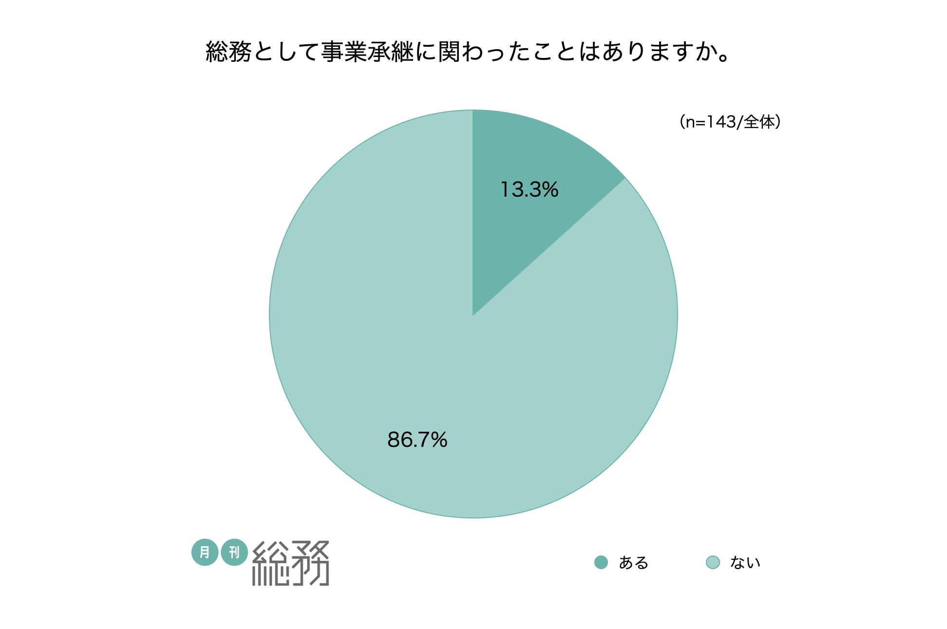 日本で唯一の総務専門誌『月刊総務』を発行する株式会社月刊総務(所在地:東京都千代田区、代表取締役:豊田健一)は、全国の総務担当者を対象に「総務と事業承継に関する調査」を実施し、143名から回答を得ました。