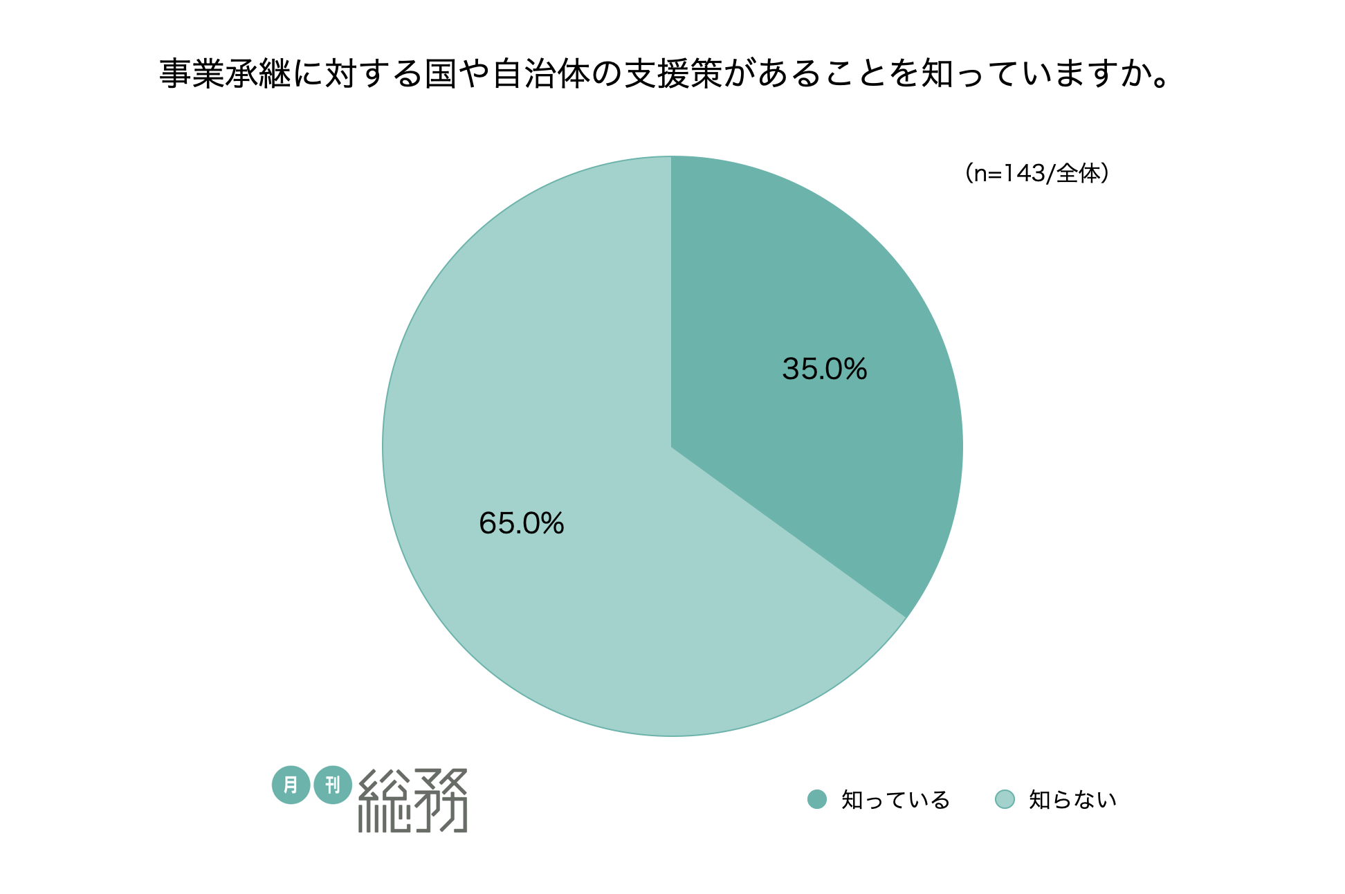 - 事業承継の公的支援策を知らない人が約7割。事業承継に関わった経験がある総務は6割以上が知っていると回答