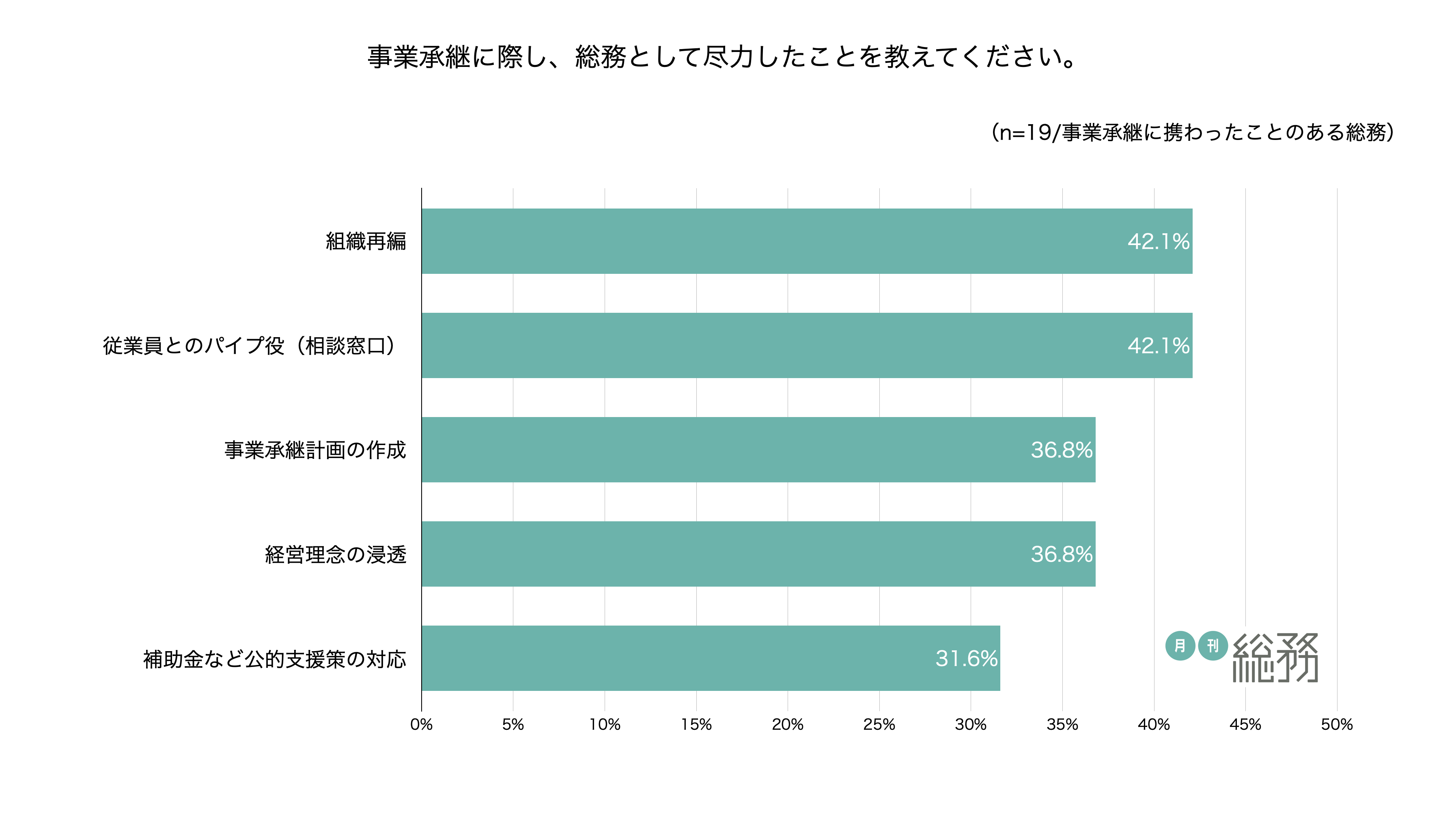 - 事業承継で総務が尽力したのは「組織再編」「従業員とのパイプ役(相談窓口)」