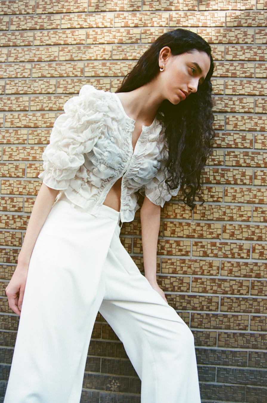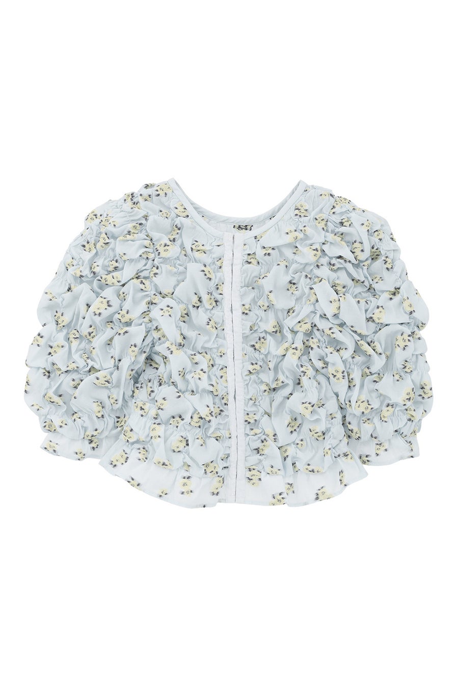 MINAMI TANAKA×CLANEのフラワージャガードシャーリングトップス。