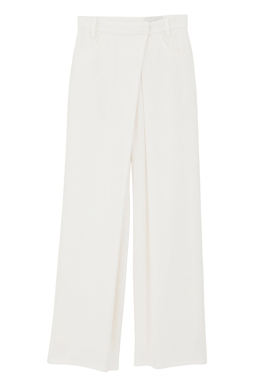 特徴的なフロントのクロスデザインが、シンプルな中にさりげないアクセントを添えます。ジャストウエストの程よくルーズなシルエットで、脚が美しく見えるラインにこだわりました。