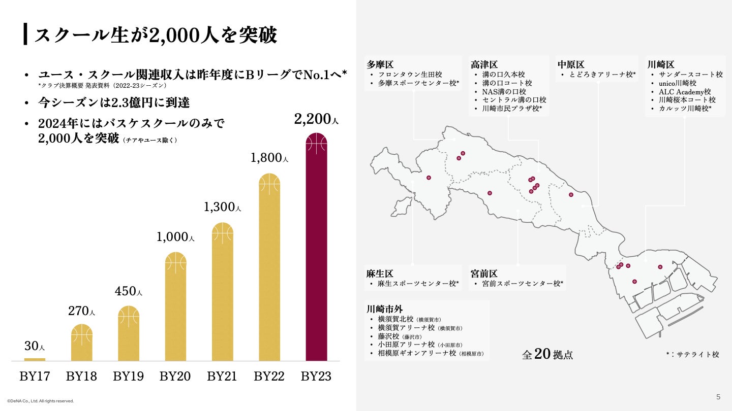 特にバスケットボールスクールにおいては、Bリーグ公表のデータにおいて、2022-23シーズン時点でBリーグ最大のユース・スクール関連収入となっておりましたが、DeNAによる承継以前の30人から、2024年にはバスケットボールスクールのみで2,000人を超える生徒(チアスクール等を含むと2,200人超)を抱え、国内最大規模のスクールへと成長を遂げました。