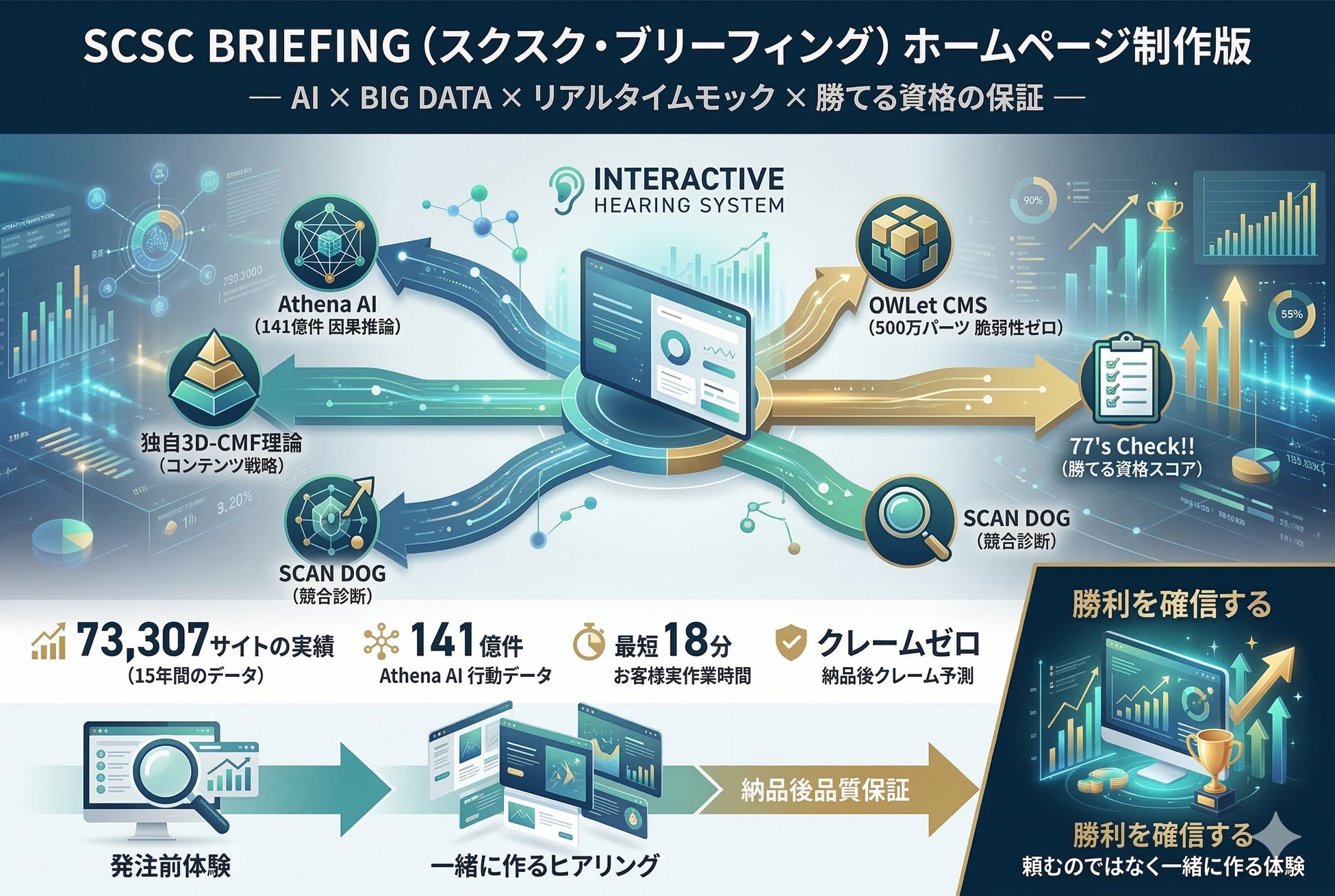 本システムは、Athena AI(141億件の行動データを持つ因果推論エンジン)・独自の3D-CMF理論・OWLet CMS(500万パーツ・15年間脆弱性ゼロ)・77's Check!!・SCAN DOGという5つのコア技術を統合し、「発注前の体験から納品後まで」を一気通貫で設計します。