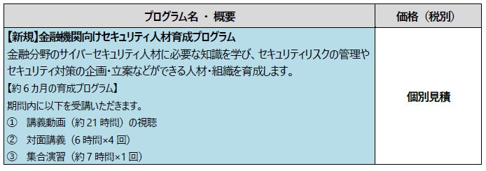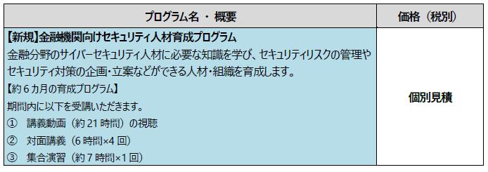 ■「金融機関向けセキュリティ人材育成プログラム」内容・価格