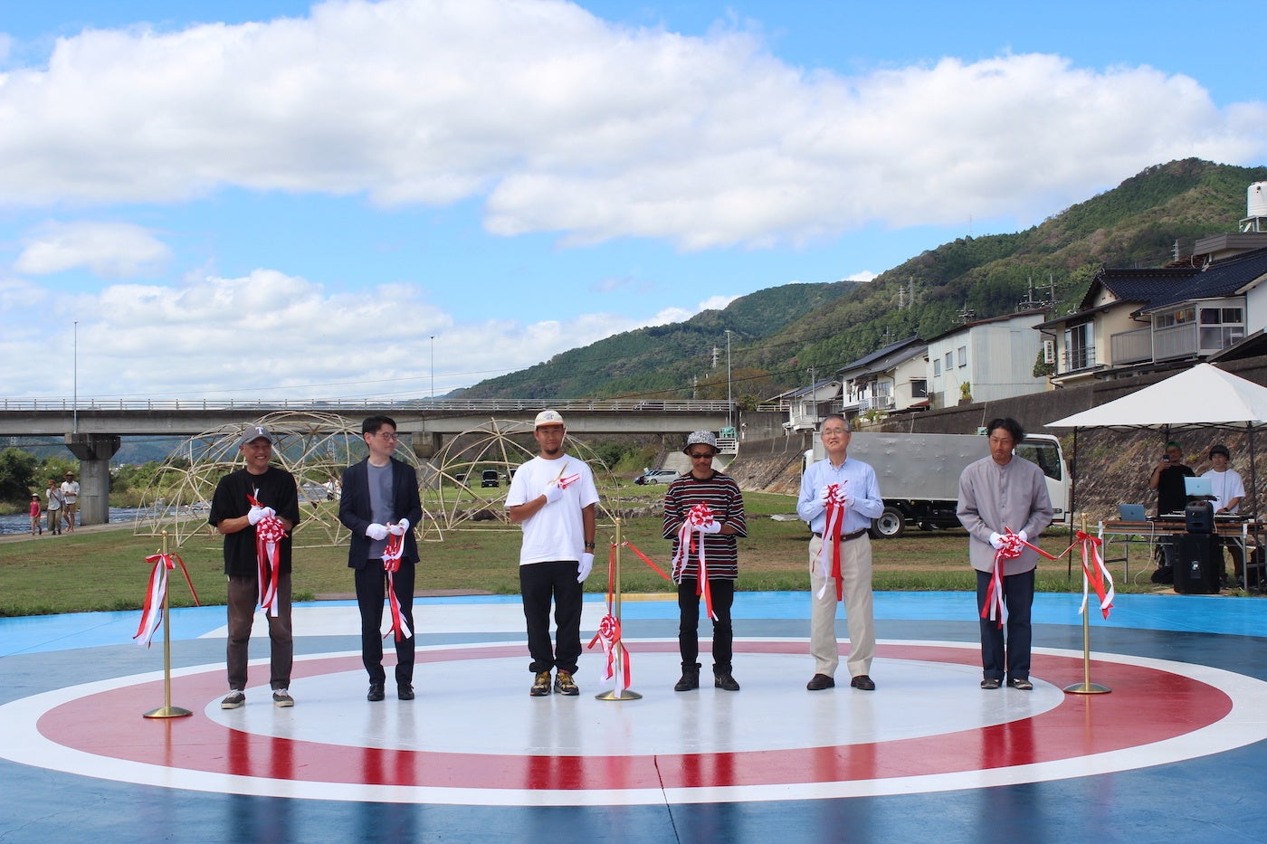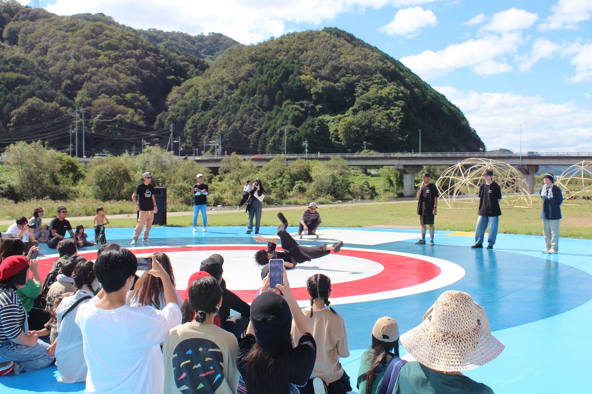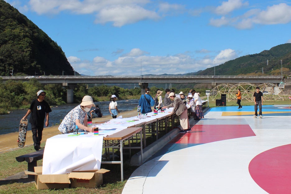 10月5日には、本プロジェクトの完成披露イベントが、久世河川敷(久世河川公園スケートボード広場)にて行われました。真庭市の太田昇市長らが参加するテープカットや、広場を囲んで地元企業のマルシェが並ぶ中でのSUIKO”氏のトークセッションや地域の若者が企画したブレイクダンスプログラムなどが実施。全長100mのDoodle Paper(超巨大お絵描き用紙)では、老若男女が自由に絵を描く機会なども創出され、床面ミューラルアートを通した、地域に活性と新たな文化交流を生み出す場となりました。