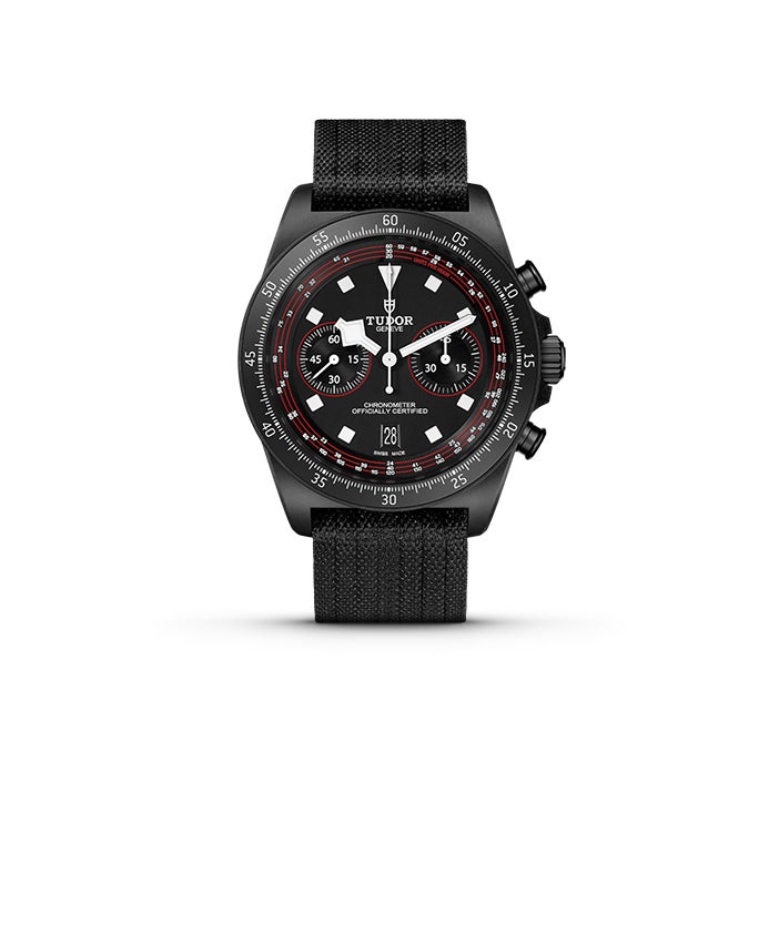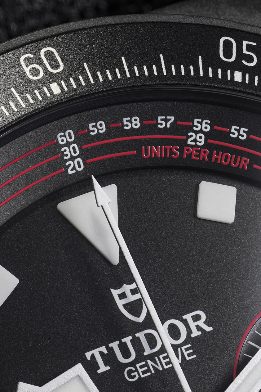 マットブラックのダイアルに赤いアクセントを効かせたこのモデルは、視認性を第一に考えつつ、TUDORプロサイクリングのチームカラーを彷彿とさせる。象徴的なスクエア型アワーマーカーと「スノーフレーク」針は、視認性を向上させるために発光面を最大化できるデザインとして、60年代にチューダーが考案。前者は、厳しい条件下でも最適な視認性を実現する発光性セラミック混合物で作られている。ダイアル外縁に45度の角度をつけて配したフランジには、タキメーターの目盛りが記されており、その内側の数字はライダーの走行速度に焦点を当てている。
