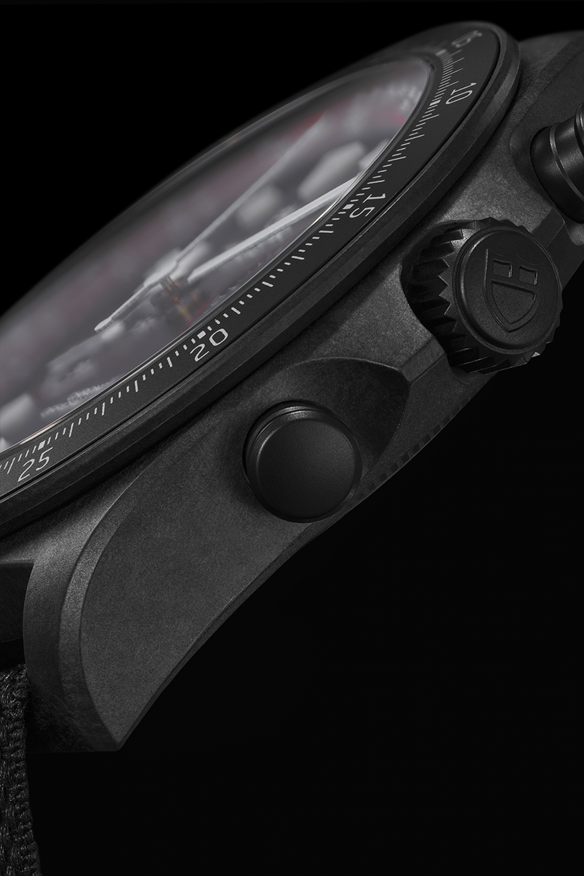 マットブラック、クロノグラフカウンターとタキメーター目盛りにレッドのアクセント