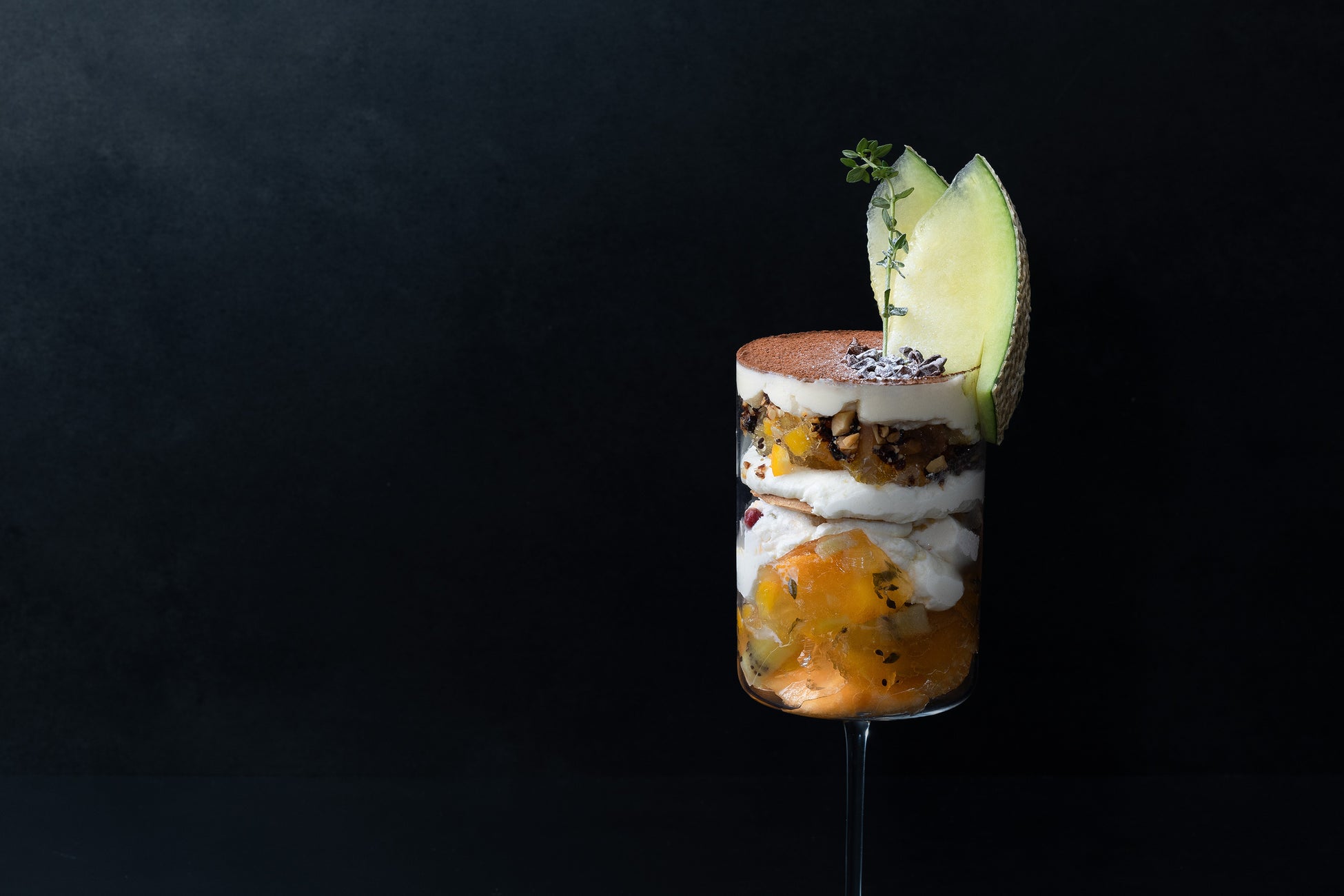 イタリアの伝統的なデザート、ドルチェ。メロンとティラミス、エスプレッソジェラート、カッサータ、さまざまなドルチェをあわせた特別な秋のパフェ。そして、それらをまとめる、タイム香るホワイトサングリアゼリーが新しい1杯です。