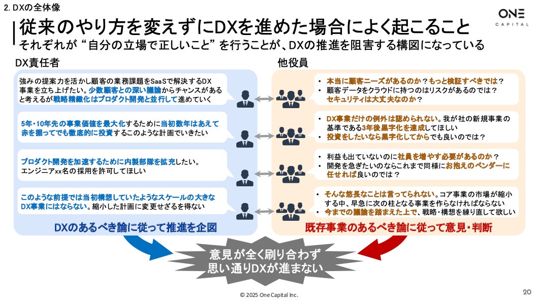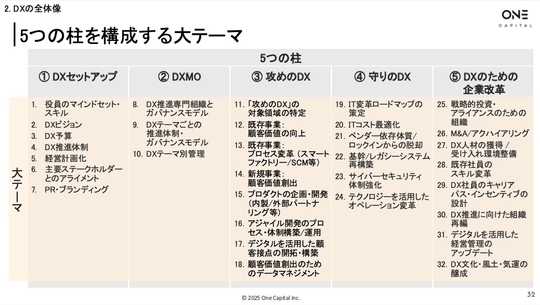 B2B SaaSをはじめとしたスタートアップへ出資するOne Capital株式会社(本社:東京都港区、代表取締役CEO:浅田慎二)は、この度、当社のDXアドバイザリーチームによる長年にわたるDX支援の知見を体系化した「DX Playbook 2025」を作成し、160ページ以上の実践ガイドとして無料公開しました。