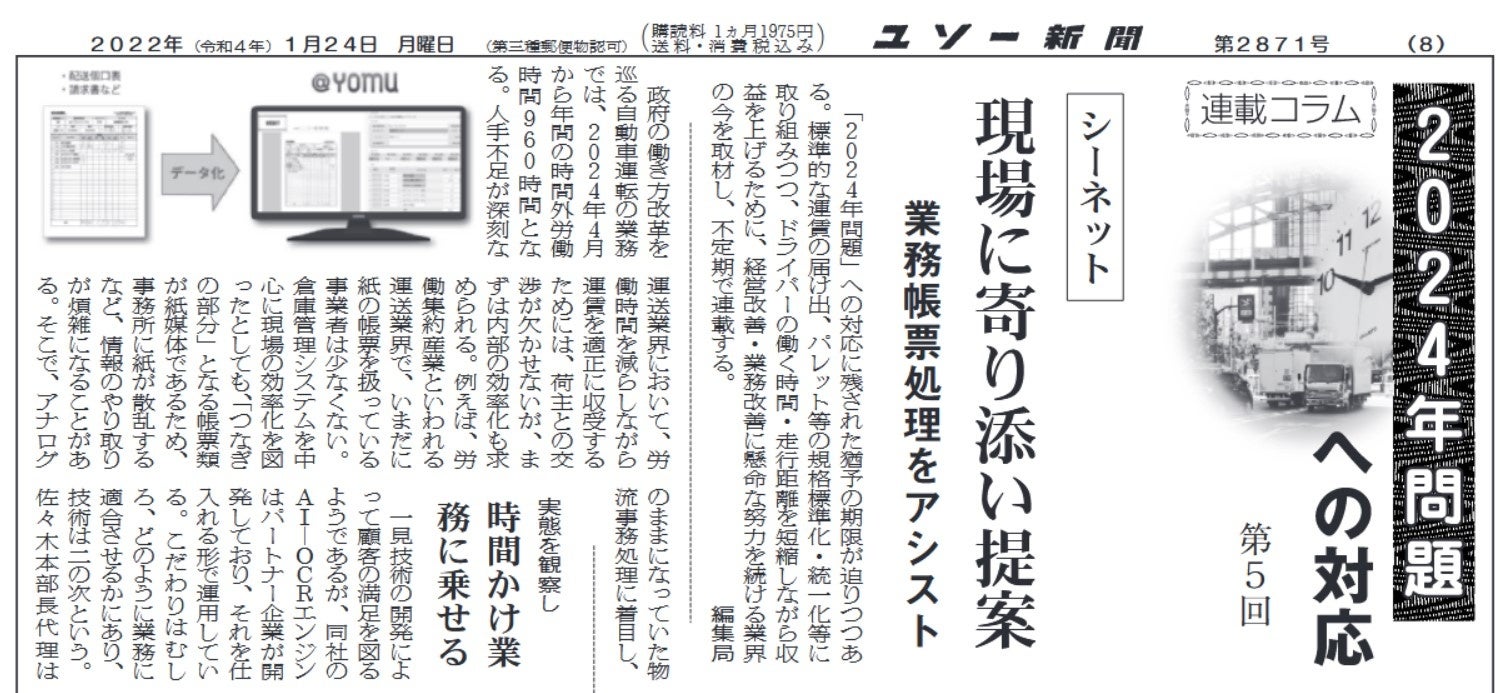 株式会社シーネット(以下シーネット、本社:千葉県船橋市、代表取締役社長:内野 靖)が提供するAI-OCR搭載Webスキャナ@YOMU(以下、@YOMU)が、物流業界専門誌である輸送新聞2022年1月24日付に掲載されました。