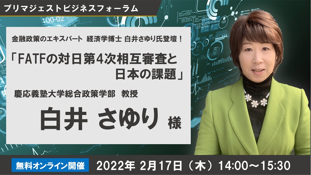ご好評いただいております、プリマジェストビジネスフォーラム2022年第一弾の開催が決定いたしました。今回は、マネーロンダリング対策をテーマに、金融政策のエキスパートである白井さゆり氏をお招きしお届けいたします。FATFから日本はマネーロンダリング対策が不十分な国との審査結果が昨夏公表されたことを受け、金融機関の対策が迫られていることについて、最新の日本の動向や対策のポイントについてお話しいただきます。