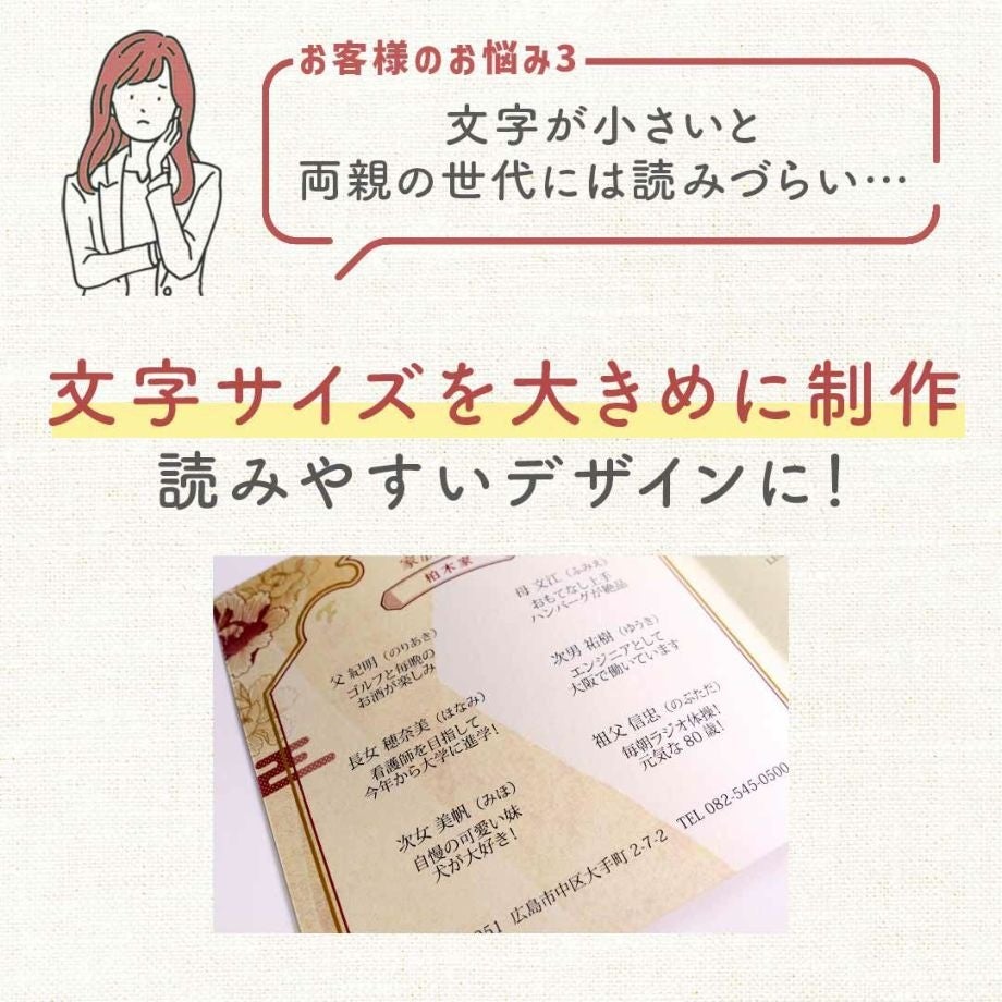 家族にとって特別な日に使うものだからこそ、だれにとっても快適でわかりやすいものを準備してほしいと思います。実際に紙で準備してくれていることを喜ばれているケースが多いですよ。