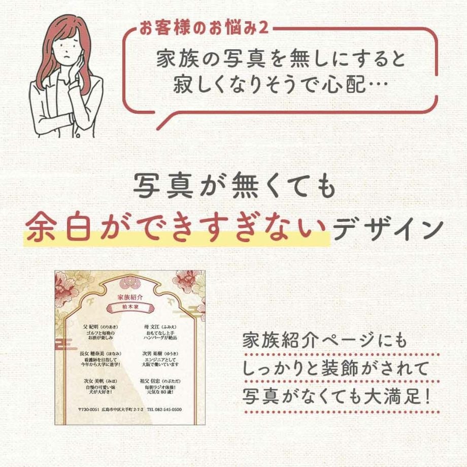 「写真が減るということは、紙面的にさみしい印象になるでは?」とご心配されるお客様もいらっしゃいますが、新作しおりは写真がなくても余白ができすぎないデザインになっているので心配無用です。