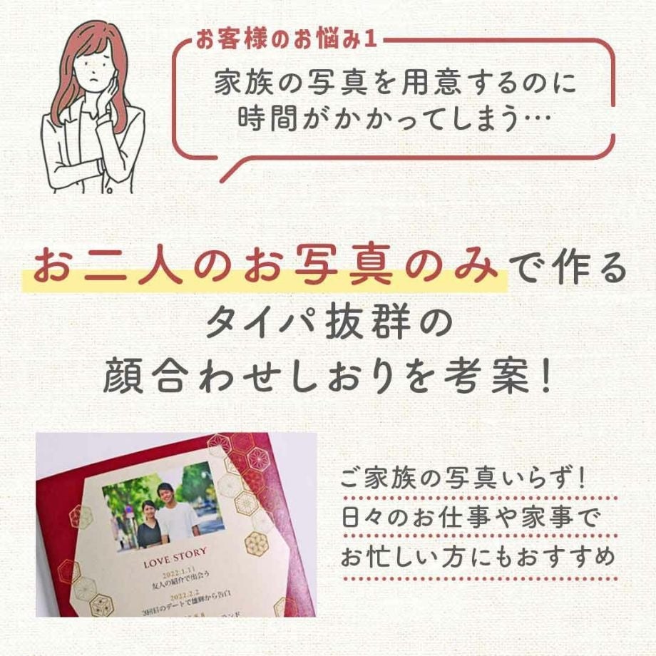 それにより、写真の準備にかかる手間や時間がなくなり、しおり準備にかける時間も軽減され「タイパ抜群」なオーダーしおりをご提案できるようになりました。