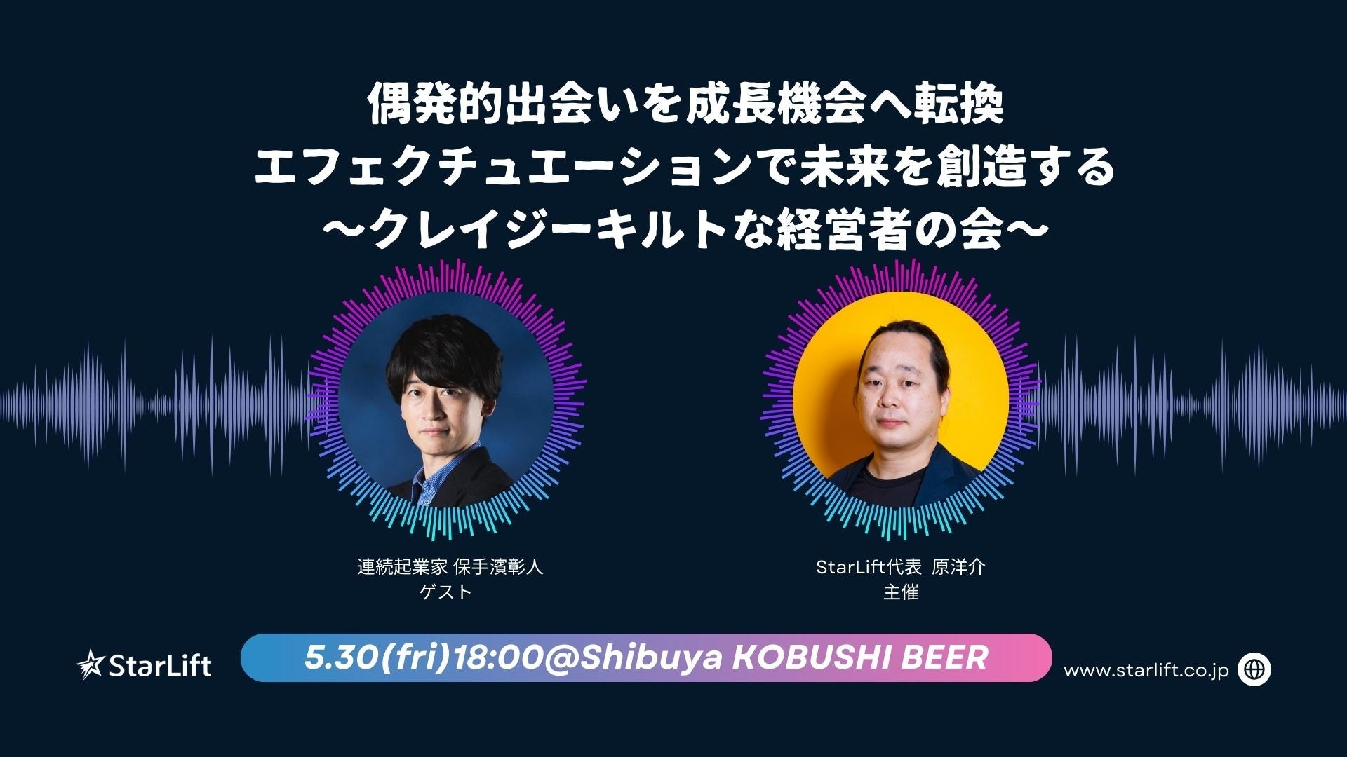【5月30日(金)18:00~】偶発的出会いを成長機会へ転換するエフェクチュエーションで未来を創造する!~クレイジーキルトな経営者の会~ by StarLift代表 原洋介 / ゲスト:連続起業家 保手濱彰人