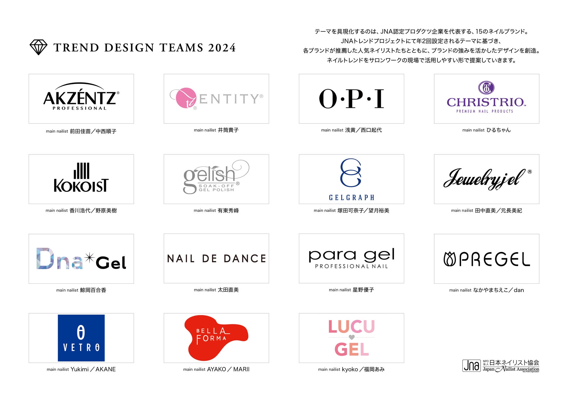 このネイルトレンドは、世界的なファッションの潮流なども踏まえ、「JNA ネイルトレンドプロジェクト(プロジェクト長 木下美穂里)」 が年2回設定し、発表しています。日本ネイリスト協会メンバーに、ネイルトレンドアドバイザーとしてモデル/ビューティジャーナリストSAKURAさんを迎え、熟考し作り上げたテーマを元に、JNAトレンドデザインチーム(JNA認定プロダクツ企業から選抜されたネイルブランドと一流ネイリスト)が、ネイルサロンのお客様に提供するアイディアとして、ネイル作品制作を担当しています。