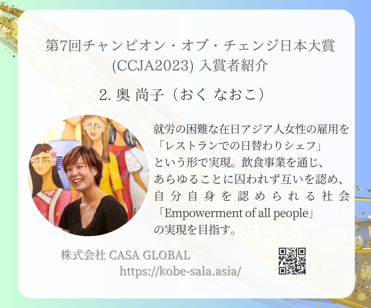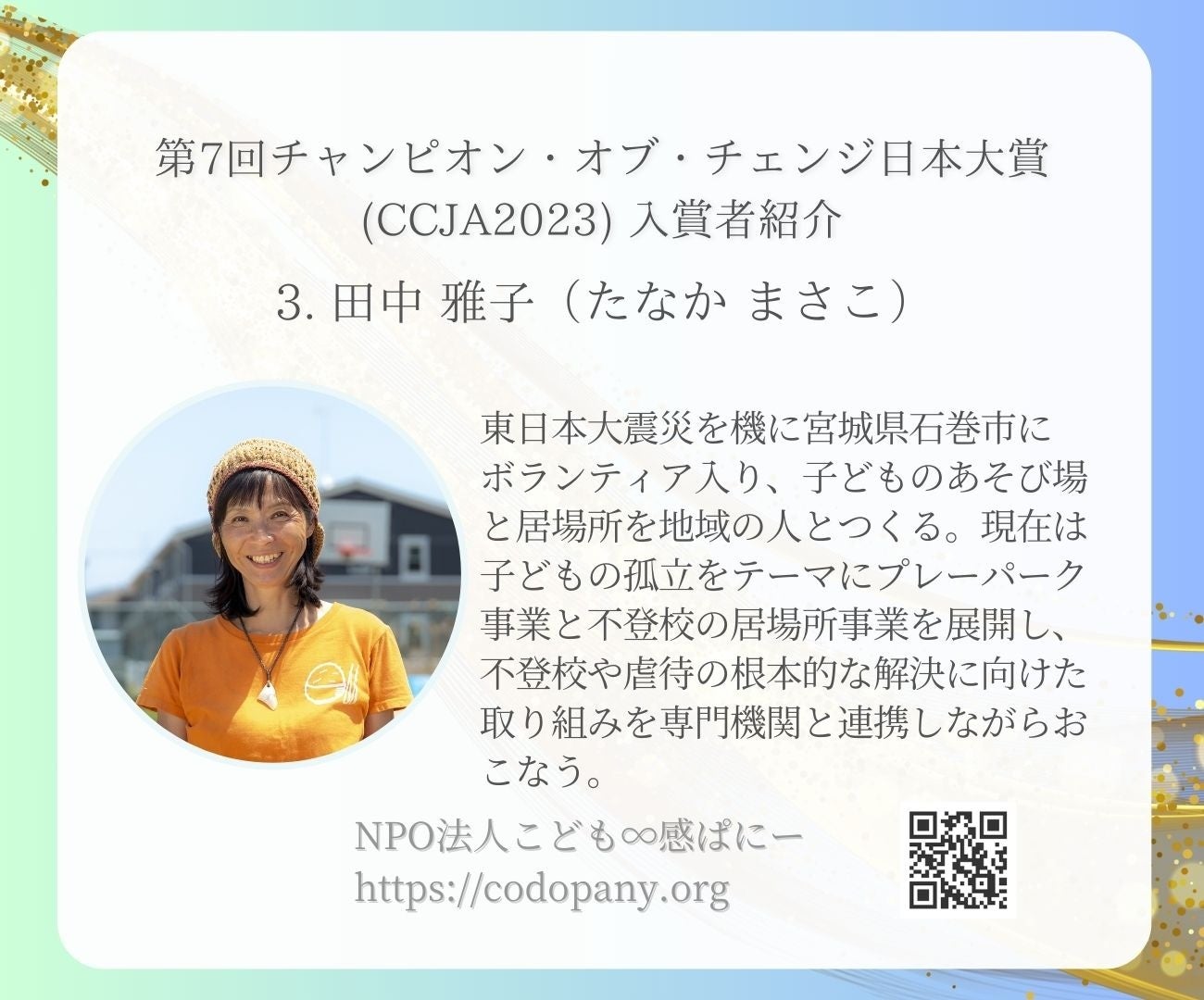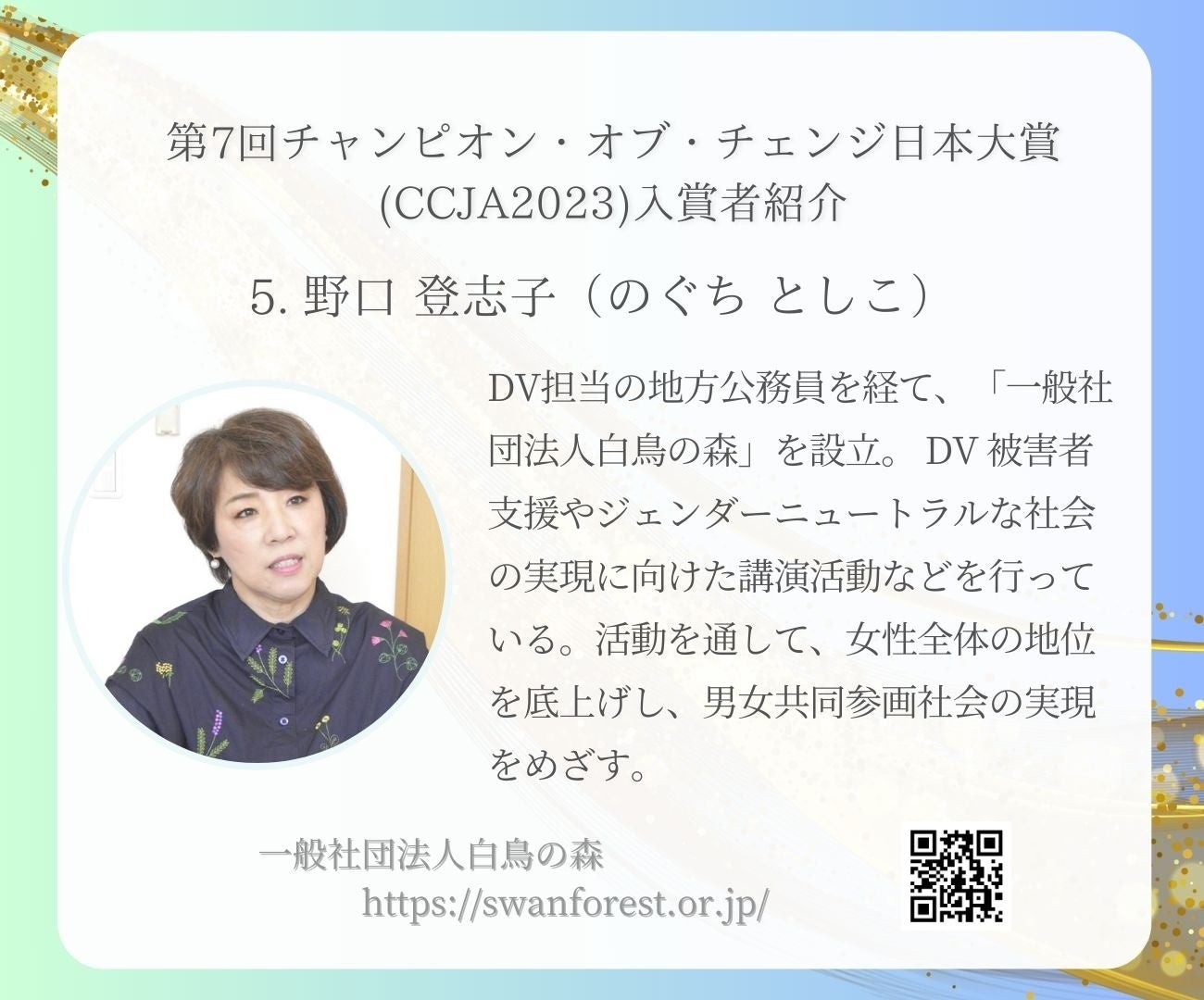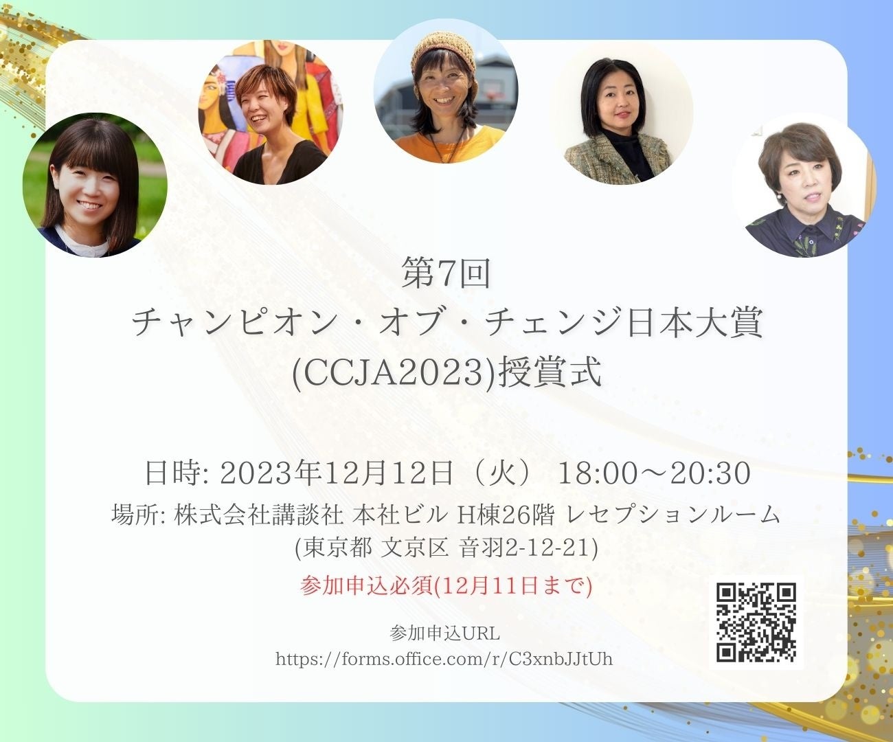 ャンピオン・オブ・チェンジ日本大賞(CCJA)を主催してきました。チャンピオン・オブ・チェンジ日本大賞は、女性のちからで誰もが安心して平等に暮らせる豊かな社会をめざし、勇気を持って行動を起こす「草の根の女性リーダー」に贈られる賞です。