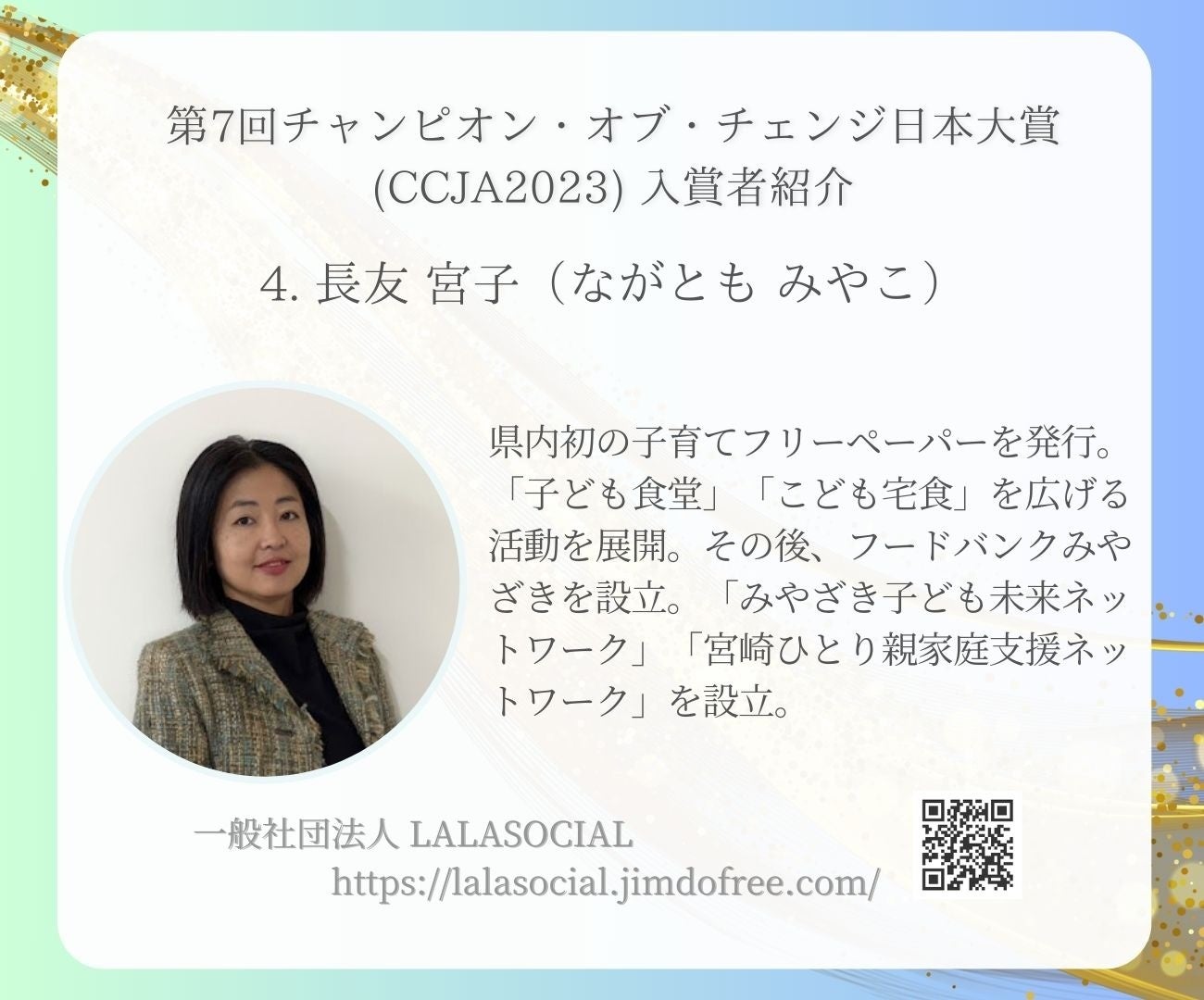 県内初の子育てフリーペーパーを発行。「子ども食堂」「こども宅食」を広げる活動を展開し、その後、フードバンクみやざきを設立。「みやざき子ども未来ネットワーク(子どもの貧困対策)」「宮崎ひとり親家庭支援ネットワーク(ひとり親支援)」等を設立。