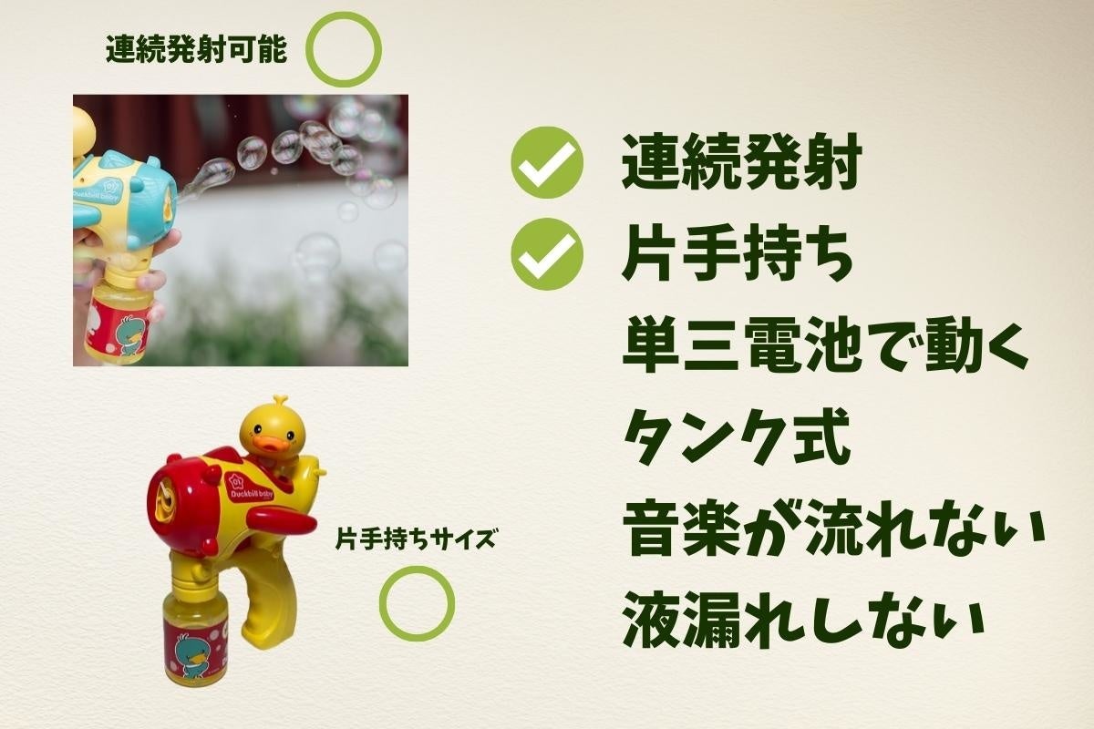 バブルガンを買う機会はあまりないかと思いますので、購入時にこのような想定をして商品ページをチェックしていないためついつい、知らずに買って後悔というケースが多いです。