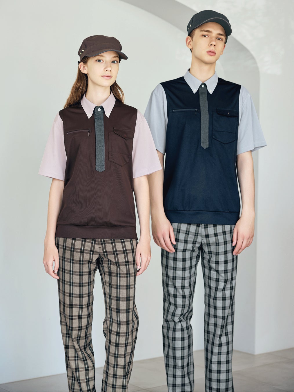 見た目のきちんと感に加え、耐塩素加工による色抜け防止機能やストレッチ素材を採用し、仕事中も安心して着用していただける新商品となっております。