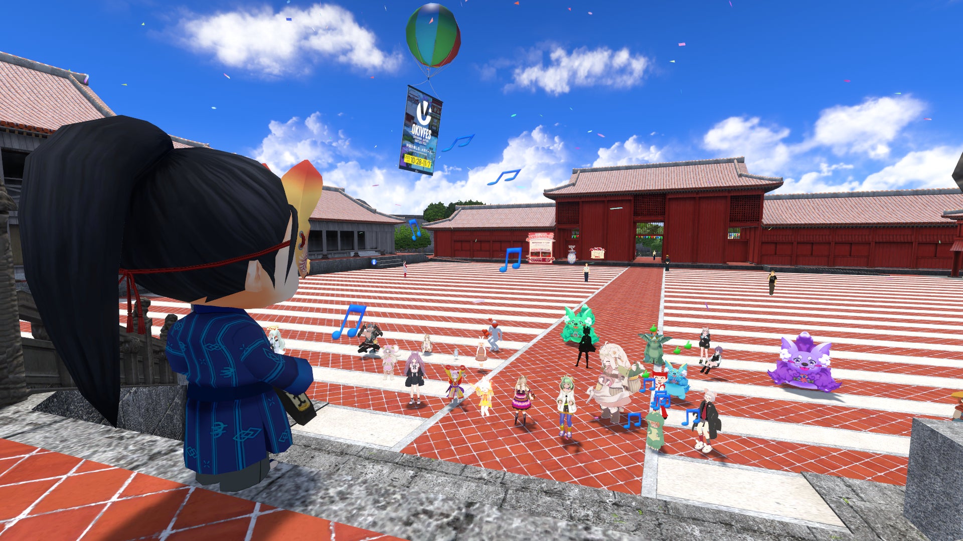 2022年10月30日(日)に、首里城エリアの正殿をバックに三線演者530(ゴサマル)さんによる、琉球音楽や三線をお楽しみいただく生ライブを開催。三線の音色に合わせて歌われる沖縄民謡や三線アレンジ楽曲に、ワールド内に集まったユーザー同士でフェーシ(掛け声)を入れたり、カチャーシーを皆で踊ったりと大いに盛り上がりました。