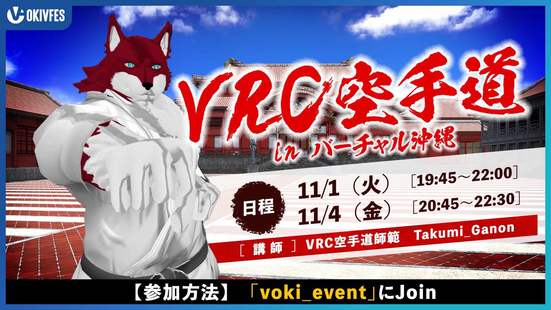 今回は、VRChat内で空手道を広める活動をしているVRC空手道師範のTakumi_Ganonさんをお呼びし、平和と礼節を重んじる武道の真髄を体感いただくことができます。