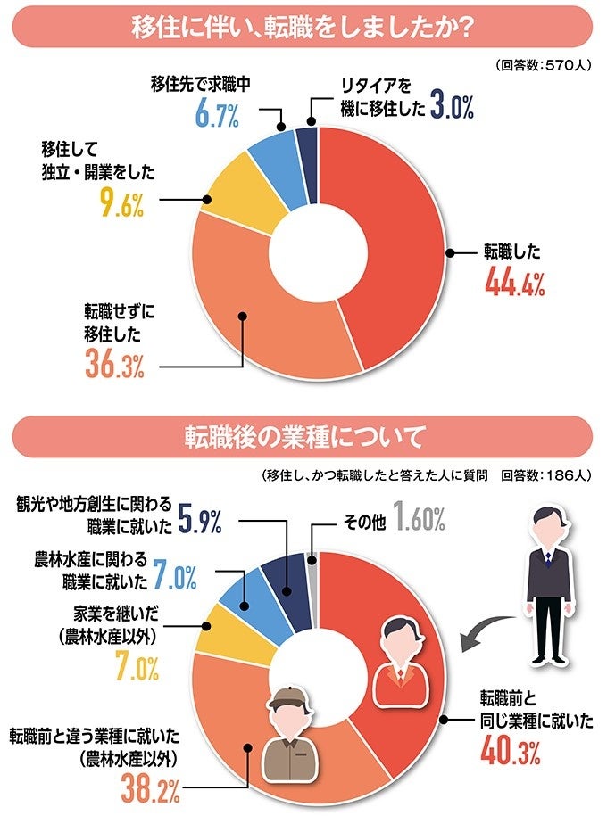 移住に伴い転職をしたのが44.4%。異業種への転職も多数派となった