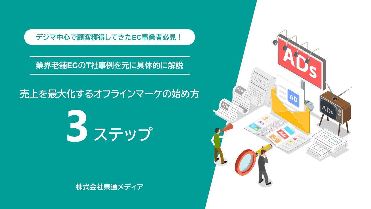 株式会社東通メディア(本社:東京都中央区、代表取締役社長:川合 孝)は、さまざまな業界業種の商材に対応できるEC/通販構築パッケージソフト「通販マーケッターEight!」(https://2ma-eight.com/)を提供しています。通販システム開発やコールセンター運営、メディアプランニング、クリエイティブ制作等も行う東通メディアは、売上を最大化するオフラインマーケの始め方を解説するホワイトペーパーを無料公開いたしました。