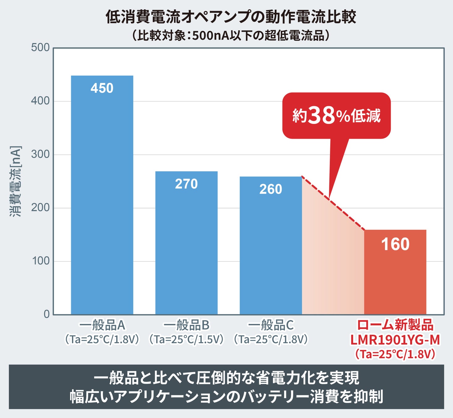 新製品は、ローム独自の超低消費電流技術により温度や電圧変化による電流増加を徹底的に抑制し、低消費電流オペアンプの一般品と比べて消費電流を約38%低減した160nA(Typ.)に抑えました。これにより、電子棚札など内蔵電池で駆動するアプリケーションの長寿命化を実現するほか、充電式バッテリーを搭載するスマートフォンなどのアプリケーションでは稼働の長時間化に貢献します。また、動作温度範囲の-40℃~+105℃において消費電流がほぼ変化しないことから、火災報知器や環境センサなど、外部の温度が変化する環境下でも安定した省電力での動作が可能です。