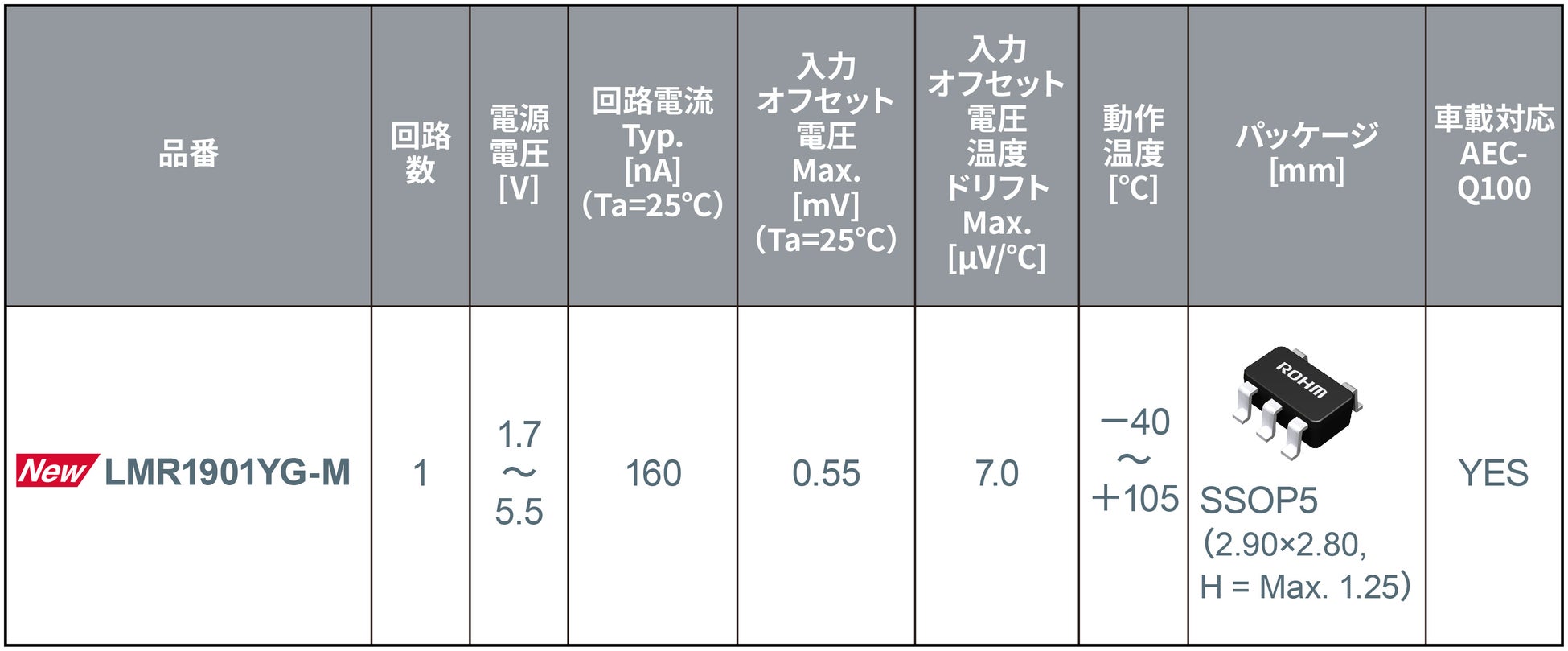 さらに、入力オフセット電圧(*1)は低消費電流オペアンプの一般品比で45%減の最大0.55mV(Ta=25℃)に抑えたほか、入力オフセット電圧温度ドリフト(*2)も最大7µV/℃を保証しており、センサ信号を高精度に増幅できます。電源電圧範囲は1.7V~5.5Vと幅広く、Rail to Rail入出力(*3)を備えることから幅広い民生機器、産業機器アプリケーションに対応可能です。車載信頼性規格「AEC-Q100」にも準拠しており、車室内など厳しい条件下でも機能性を損なわず安定した動作が可能です。
