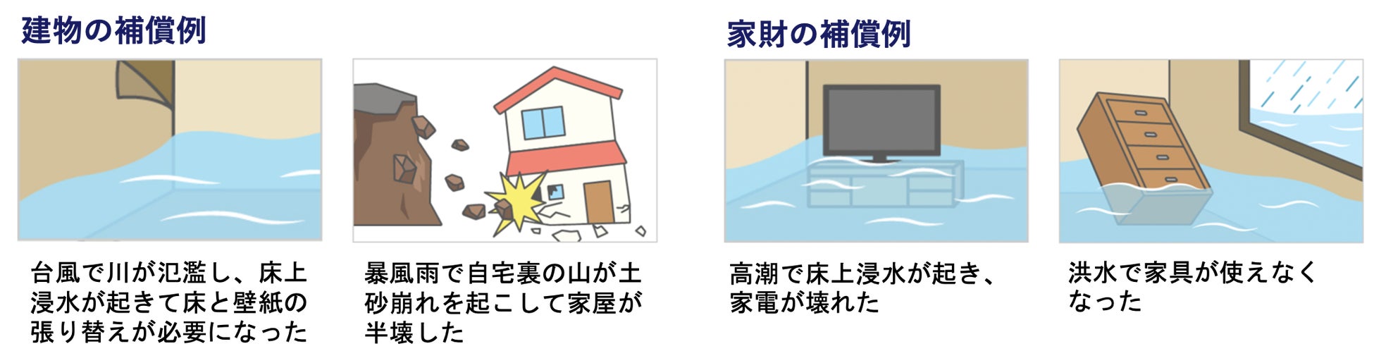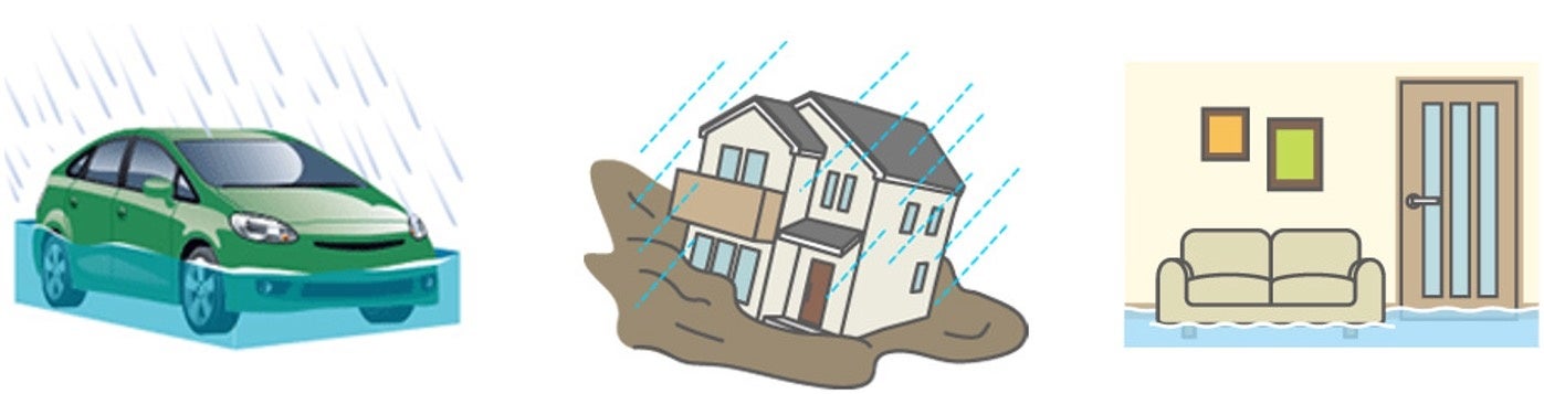 台風や暴風雨などが原因で起こる洪水・高潮・土砂崩れなどにより、建物や家財に再調達価額*の30%以上の損害が生じたとき、または建物が床上浸水もしくは地盤面より45cmを超える浸水となった結果、損害が生じたときに、保険金を支払います。