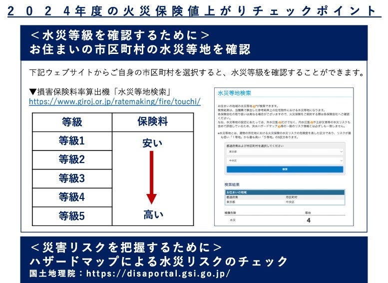 今回の改定は参考純率の引上げだけではなく、これまで全国一律であった火災保険の水災料率が細分化されます。水災リスクが最も低い「1等地」から最も高い「5等地」の5つに区分され、水災リスクが高いエリアにお住まいの方は火災保険料が値上げとなる可能性があるため、居住エリアの自然災害リスクを正しく把握し、補償内容について適切な選択や見直しを行うことが重要です。