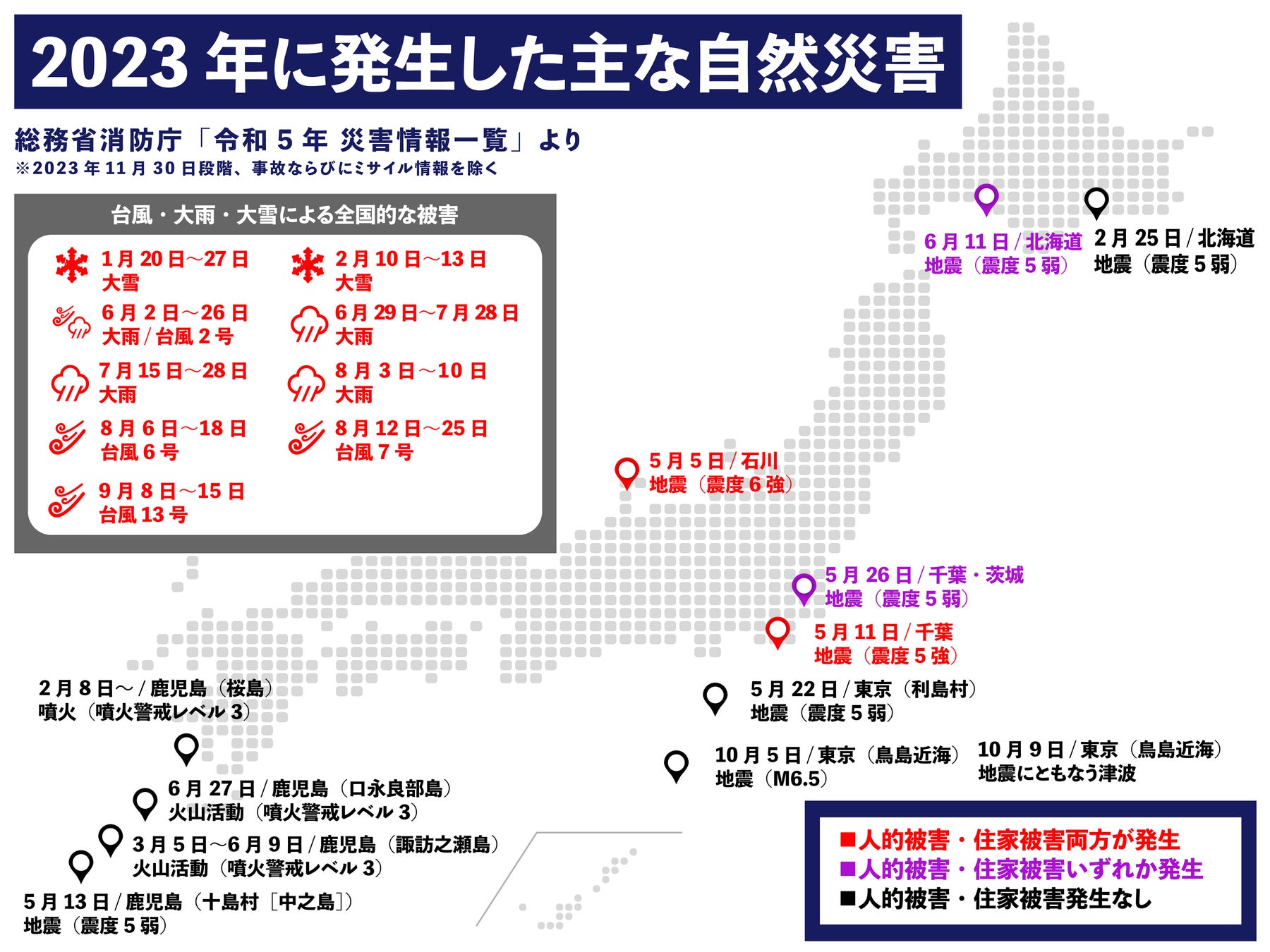 2023年に発生した主な自然災害をまとめたインフォグラフィックを公開 加入している火災保険の補償内容を確認し自然災害への対策を