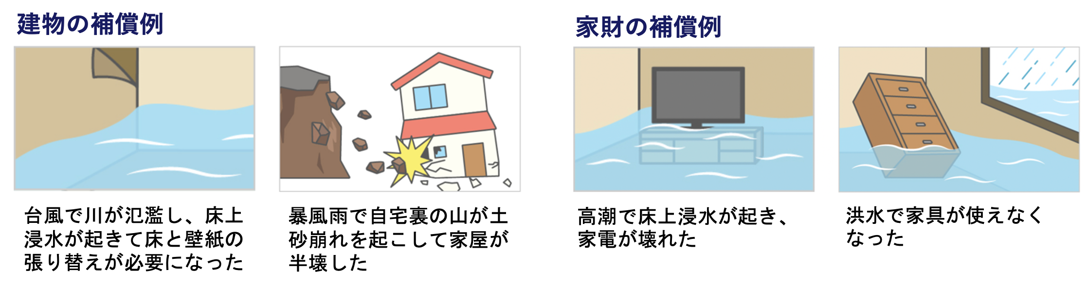 また火災保険では、補償対象を建物・家財の単位で選択します。水災の場合でも、範囲をどのように選択しているかによって被害に遭った際に補償される対象が異なってきます。