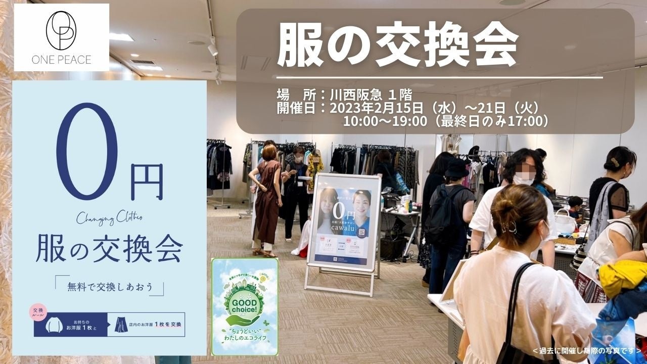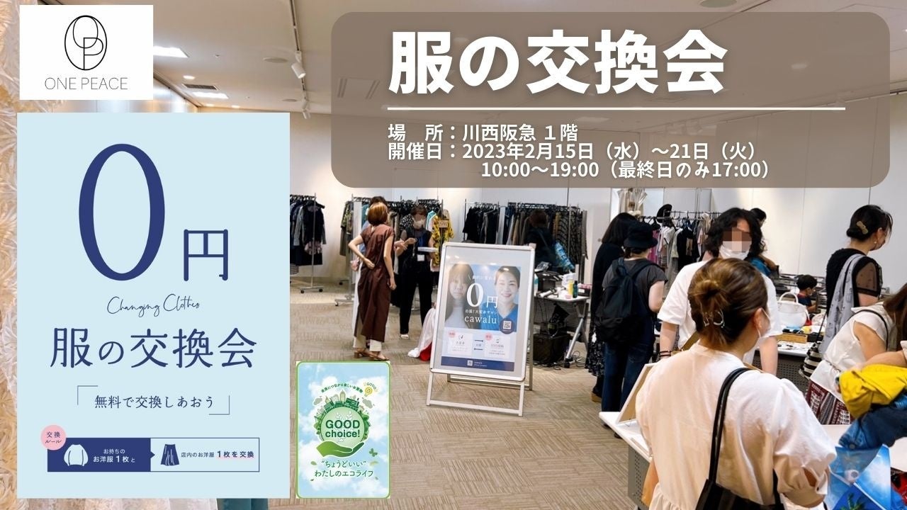 「人々の毎日に、幸せや歓びや感動の溢れる世界をつくる。」を企業コンセプトに掲げる株式会社ワンピース(本社:兵庫県加古川市、代表取締役:久本和明、以下ワンピース)は、SDGsの一環として、関東・関西・九州で開催し、すでに延べ2万7000人以上が参加している「服の交換会」イベントを、百貨店で初開催しております。川西阪急1Fで2023年2月15日~21日に開催中であることをお知らせします。