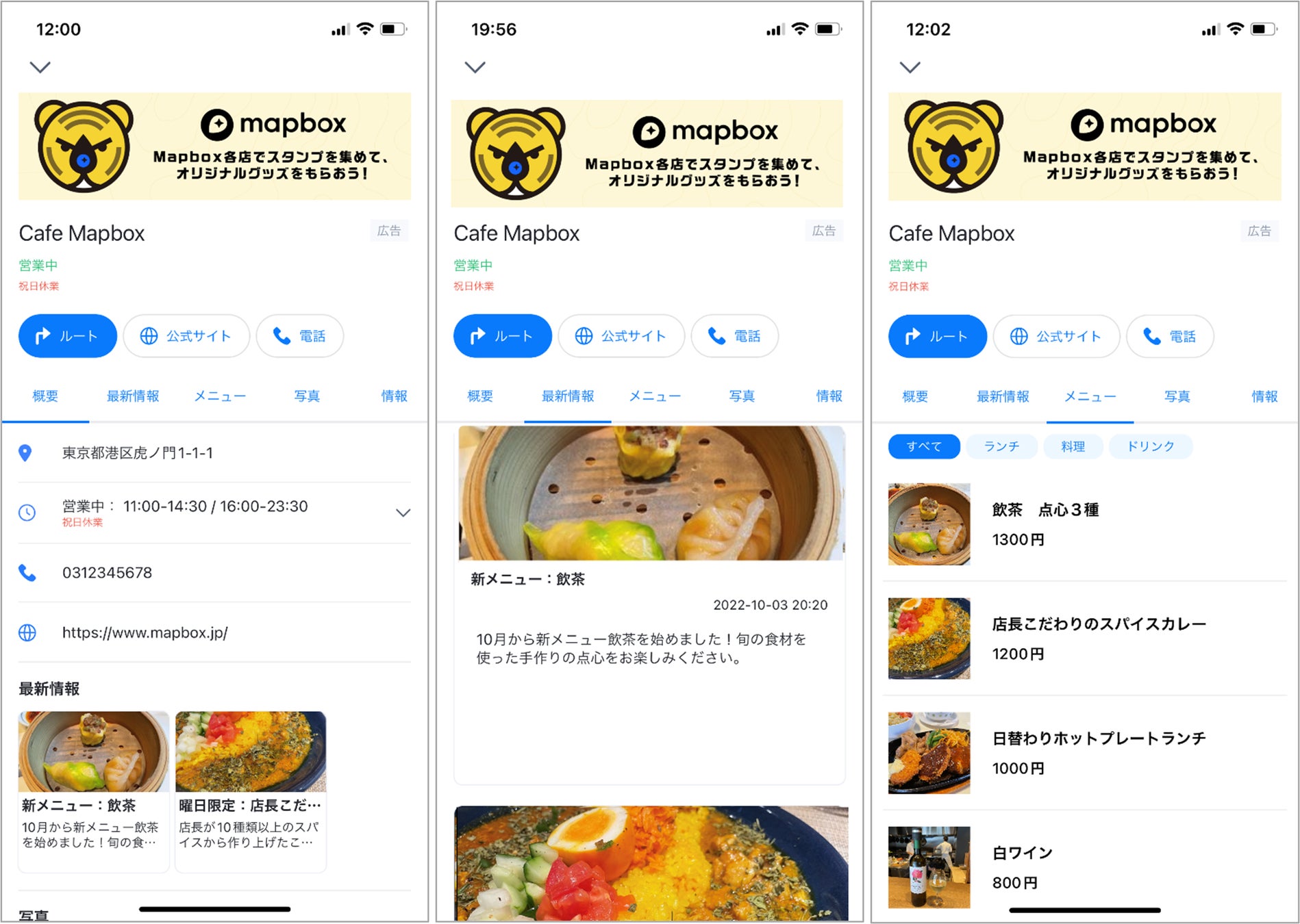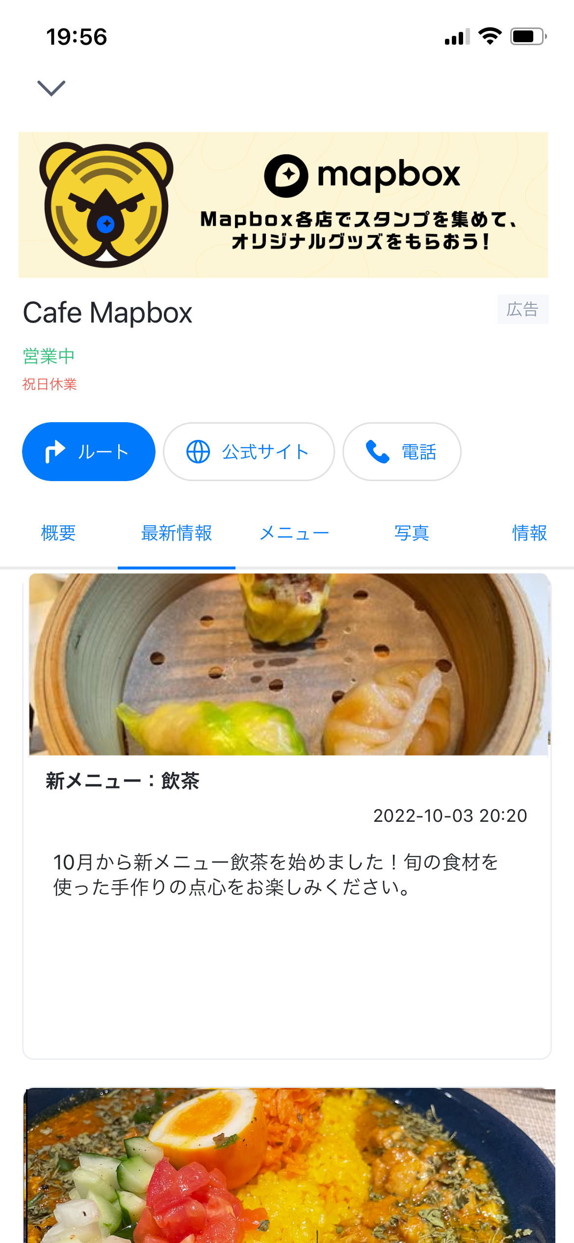 『Mapboxプロモーテッド・ピン広告』では、地図上に広告主独自のアイコンが配置され、タップすると広告主の情報が記された「広告カード」が表示されます。今回の機能拡張では、広告カードをスワイプで全画面表示可能にし、情報タブも追加しました。これにより、以下のことが可能になりました。