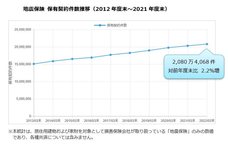 地震保険 保有契約件数 30年連続増加 2,080万4,068件(2021年度末現在、対前年度末比2.2%増)