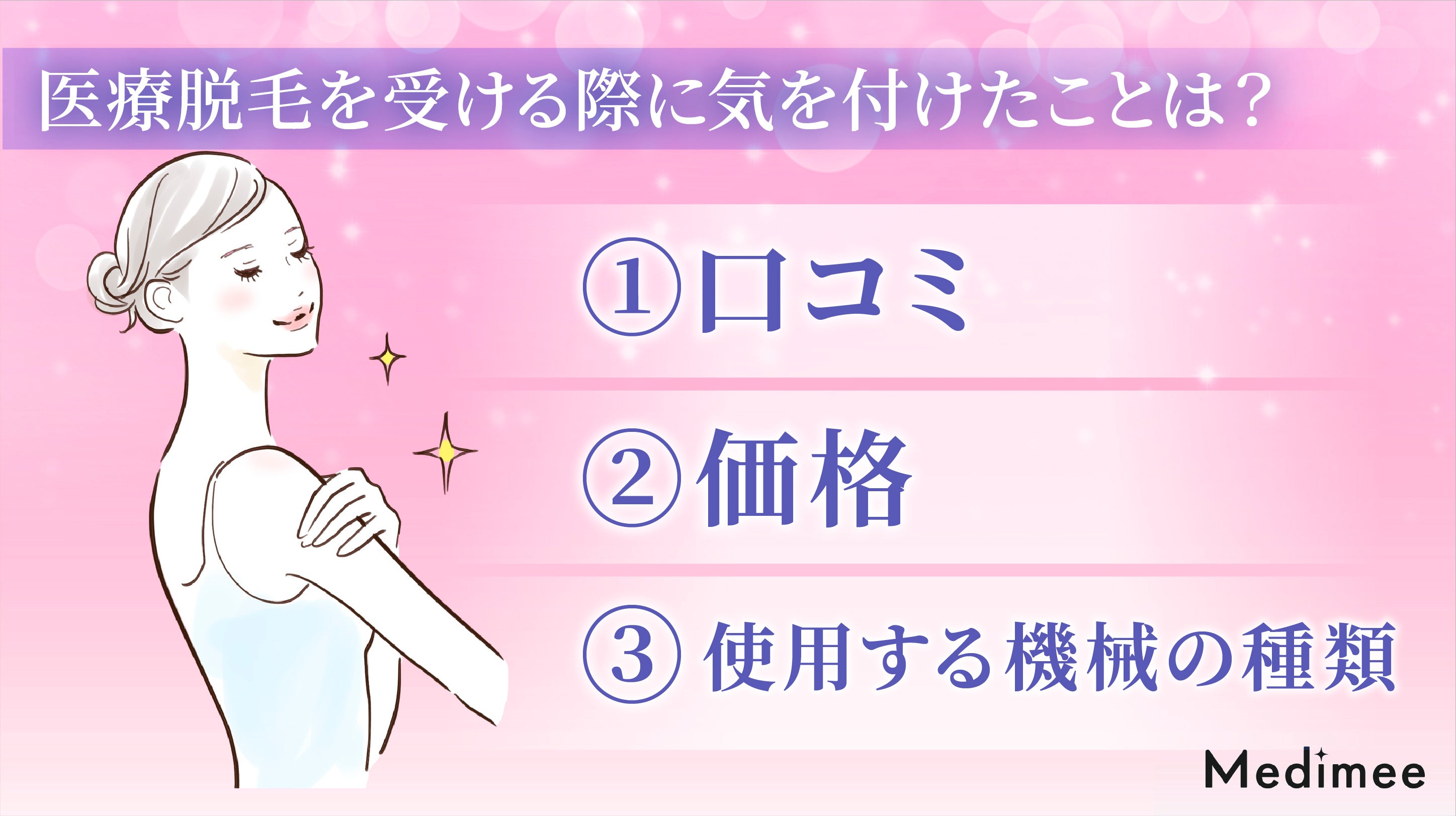 医療脱毛経験者が、医療脱毛を受ける際に気を付けたポイントとして、特に多かったのは以下の3つです。