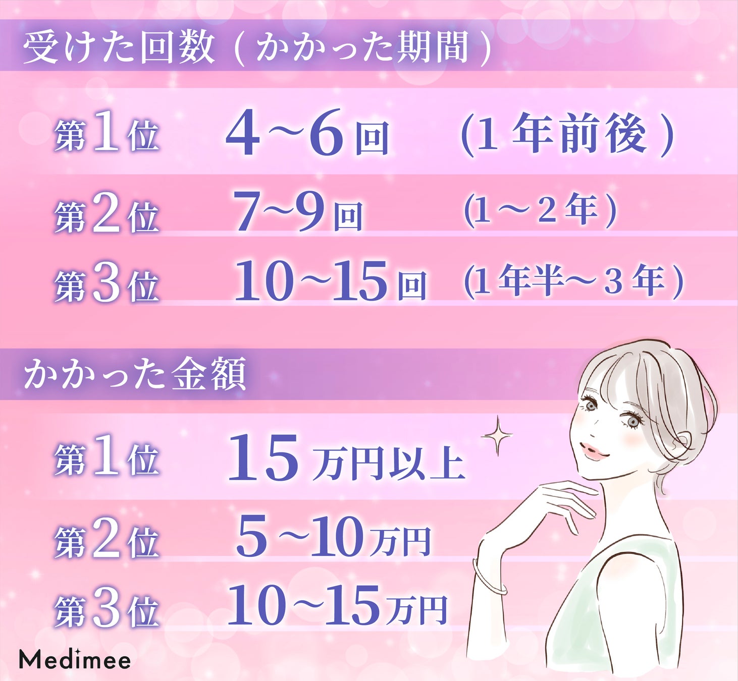 医療脱毛経験者は、医療脱毛に「4~6回」、そして「15万円以上」かけている人が多いことが分かりました。「15万円以上」かかった人は、「全身脱毛」に加えて「VIO脱毛」「顔脱毛」をセットで行っている人が多く見られました。一方、「5~15万円」かかった人やそれ以下の人は、「全身脱毛のみ」や「特定の部位のみ」脱毛を行ってる人が多いという傾向が見られました。