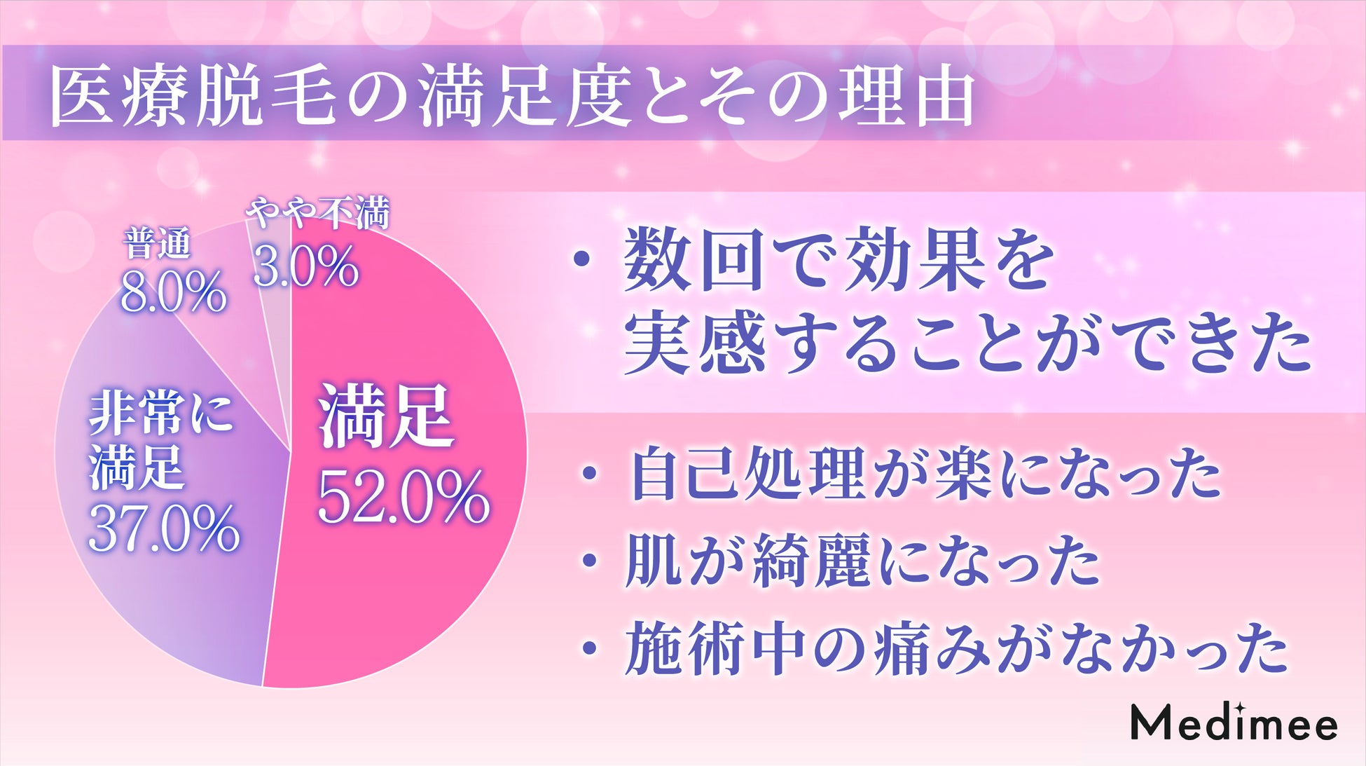 約90%の医療脱毛経験者が、医療脱毛に対して満足していることが分かりました。また、満足度に対する理由としては、主に以下のような回答が得られました。