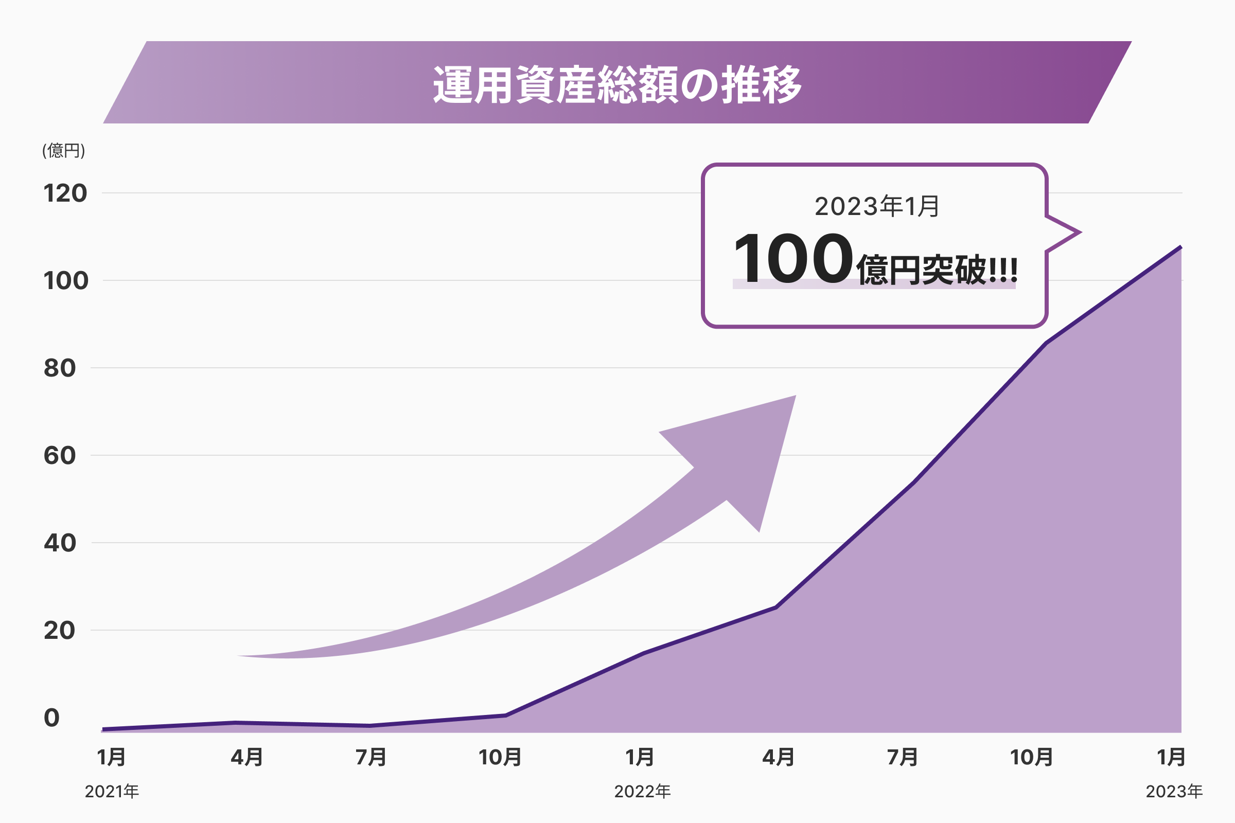 バンカーズは、2020年12月にサービスを開始して以来、これまで数多くの投資家のみなさまに支えられ、安定してファンドをご提供してまいりました。2022年5月には旧SBIソーシャルレンディングの投資家のみなさまもお迎えし、また、2023年1月にはクラウドクレジットが当社グループの一員となる中、バンカーズとしては、さまざまなファイナンススキームを駆使したファンドの組成・販売に注力し、借手企業の資金ニーズを融資型ファンドという投資商品を通じて投資家のみなさまへご提供するファイナンスプラットフォームの育成に邁進し、サービス開始以来、2023年1月31日時点ではじめて運用資産総額が100億円を突破いたしました。